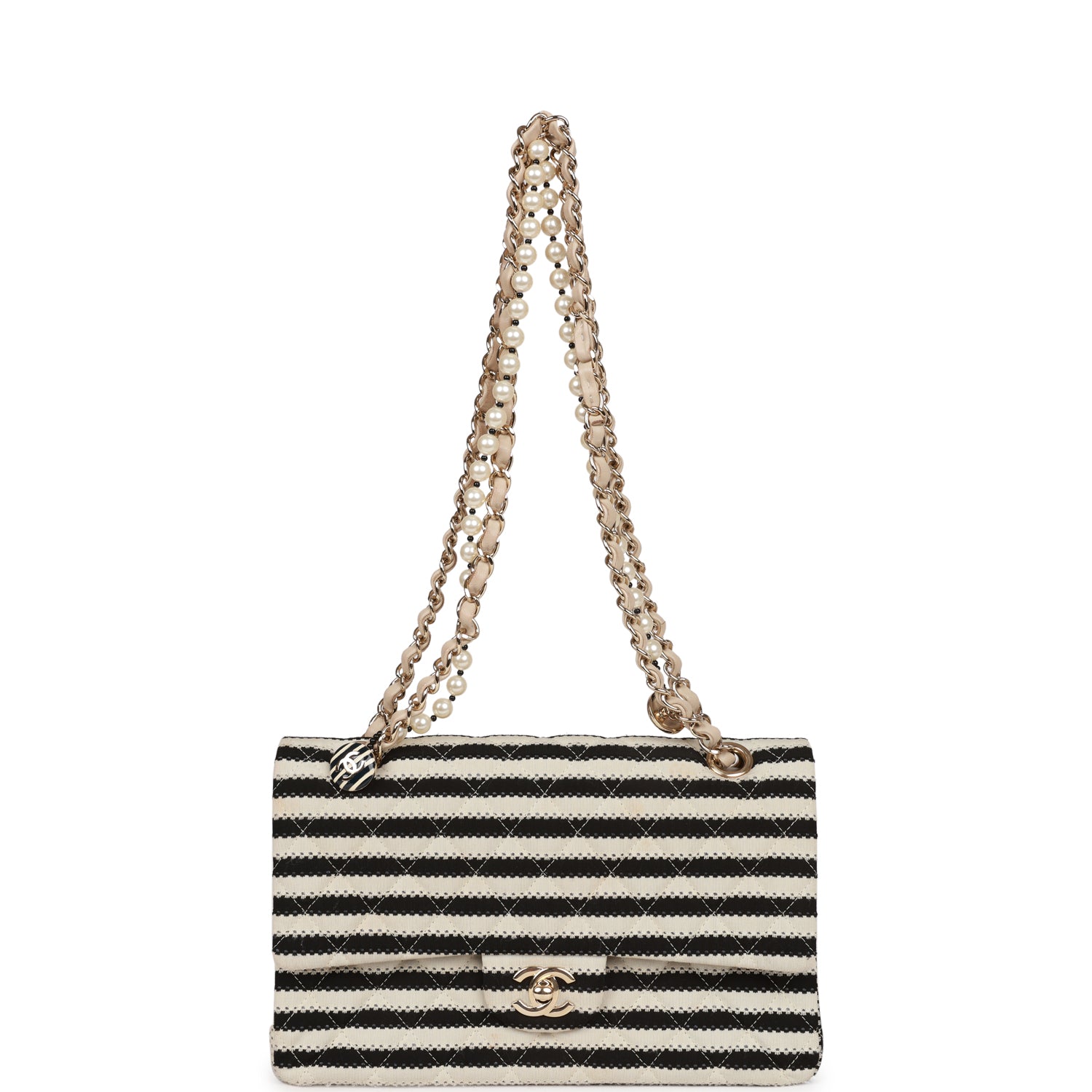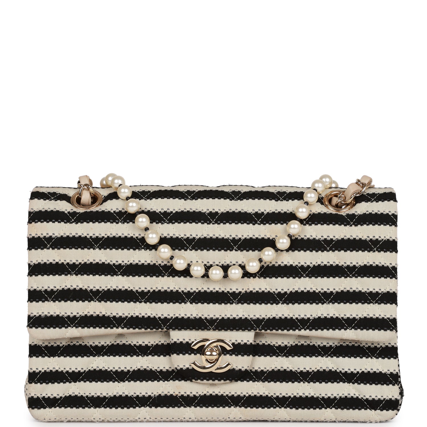 This Medium Double Flap bag is in Black and Beige striped jersey with light gold hardware, front flap with CC turnlock closure, half moon back pocket, interwoven light gold tone chain link and white leather shoulder/crossbody strap with faux pearls.
