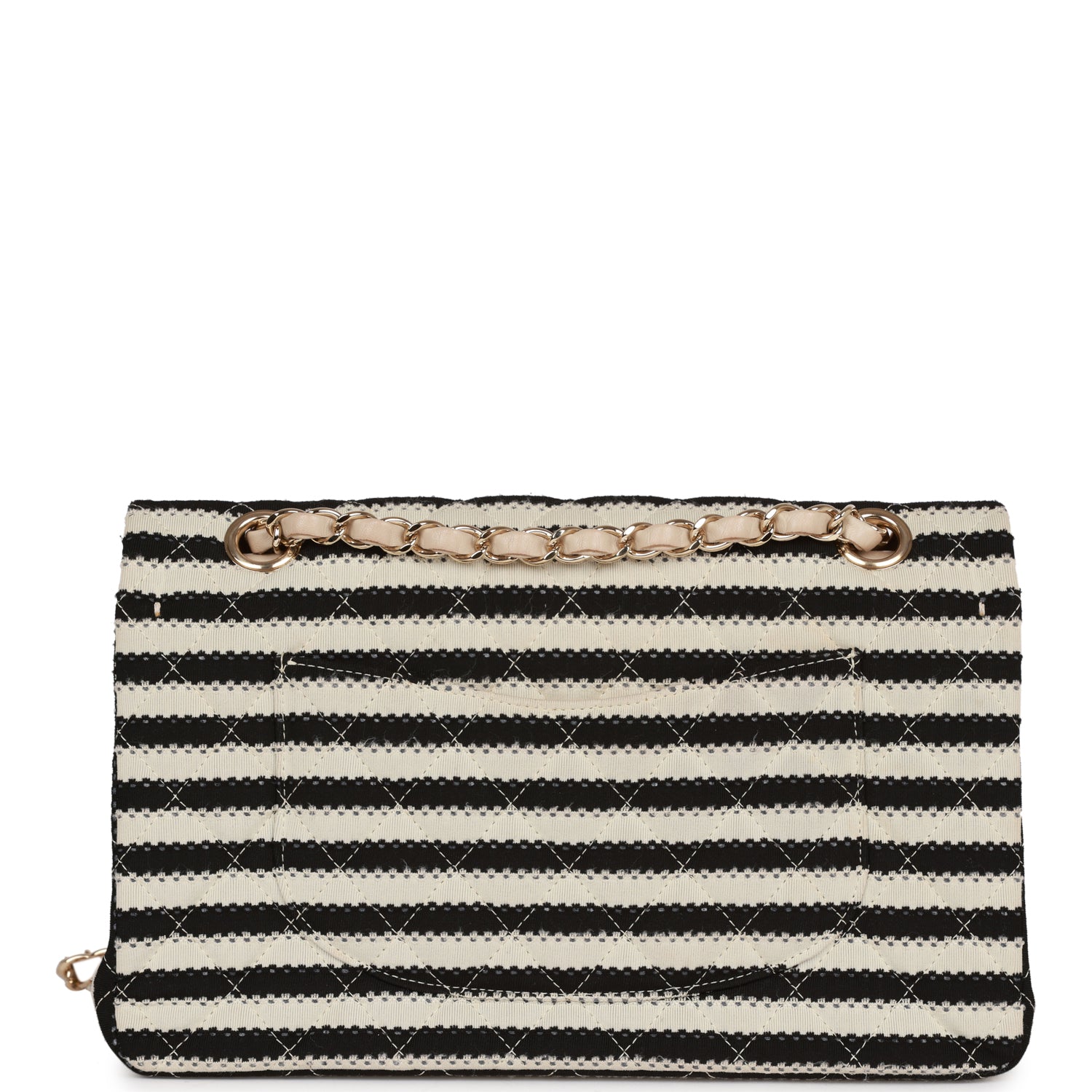 Chanel Medium Classic Double Flap Bag Black and Beige Striped Silk Light Gold Hardware