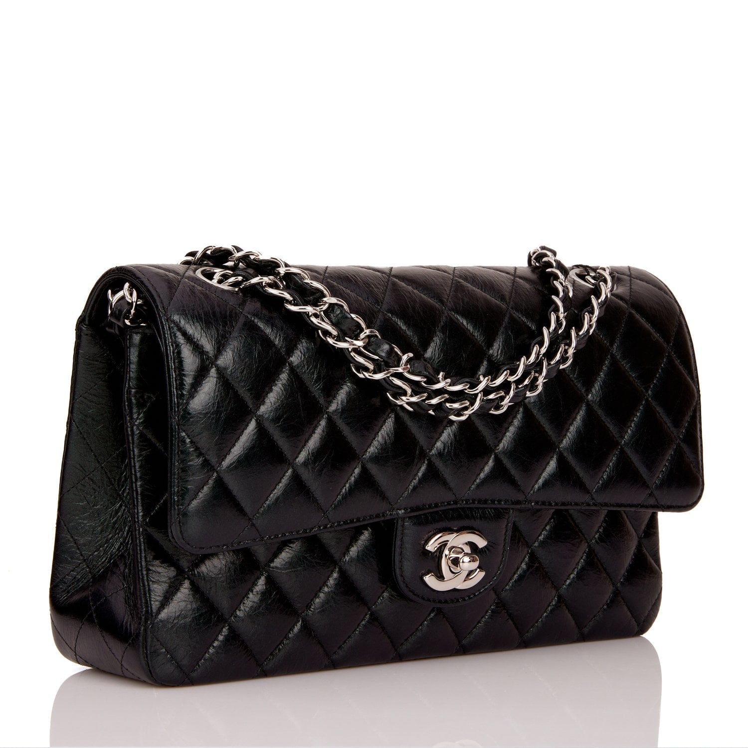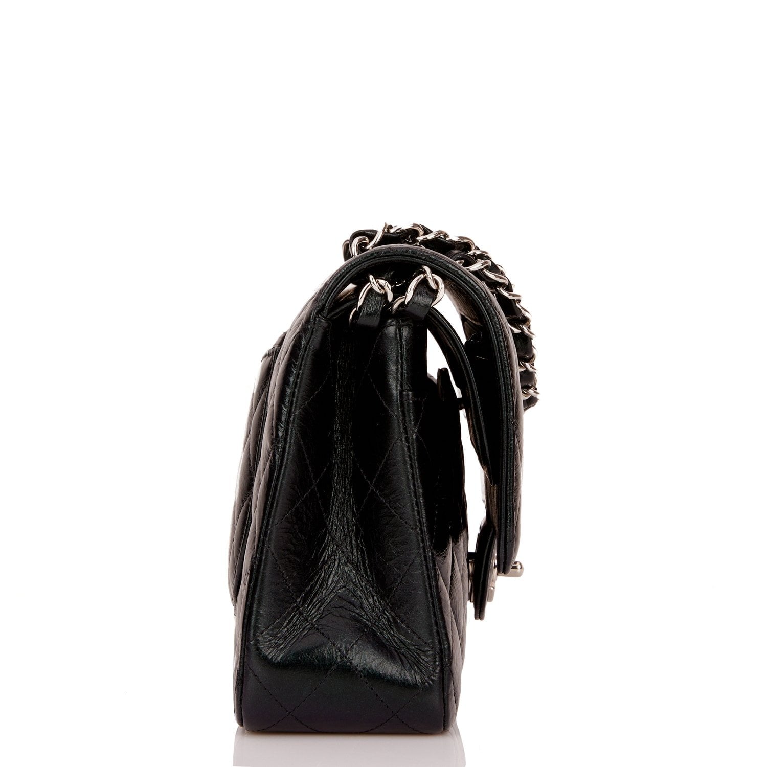 This Medium Classic Double Flap bag is in black iridescent crumpled calfskin leather with silver tone hardware and features a front flap with signature CC turnlock closure, half moon back pocket, and adjustable interwoven silver tone chain link and black leather shoulder strap.