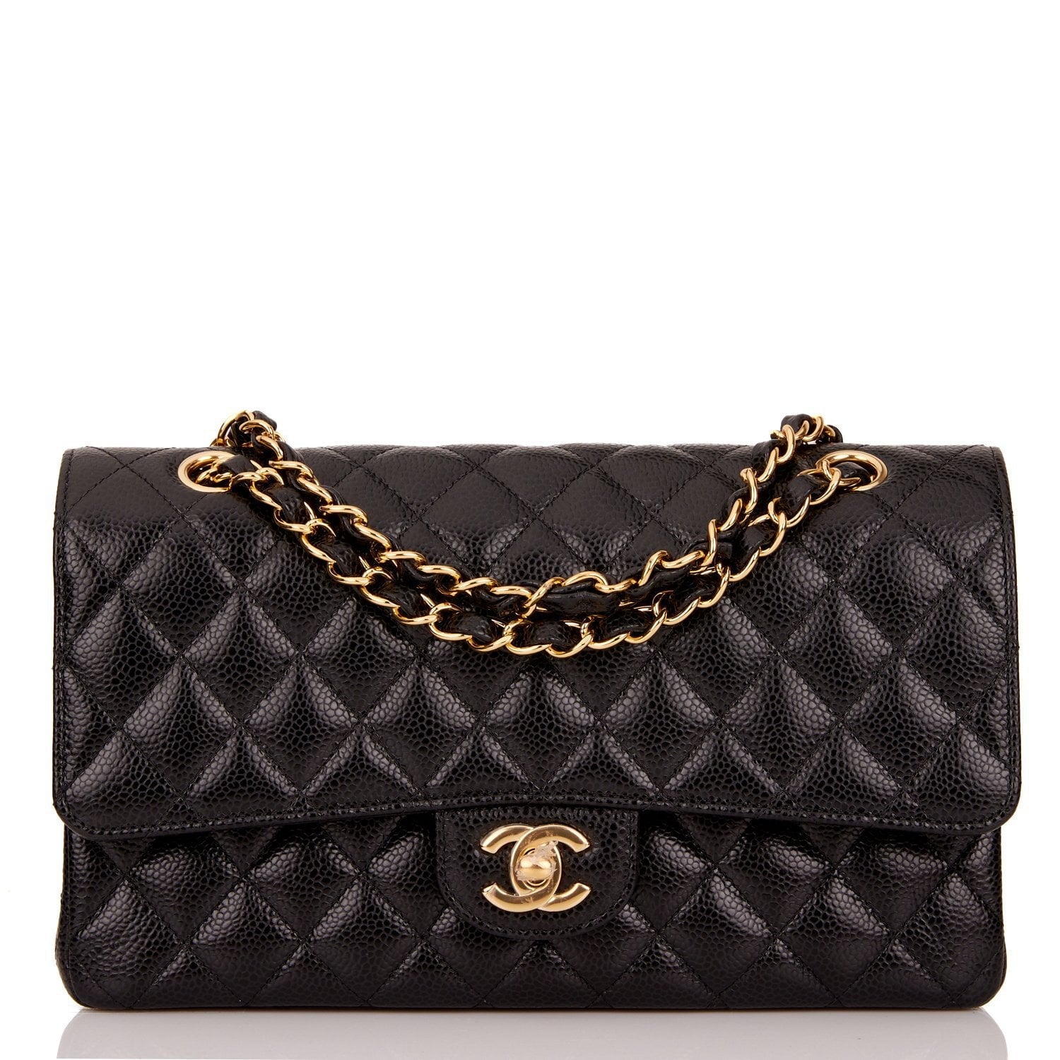 This Medium Classic Double Flap bag is in black caviar leather with gold tone hardware and features a front flap with signature CC turnlock closure, half moon back pocket, and adjustable interwoven gold tone chain link and black leather shoulder strap.