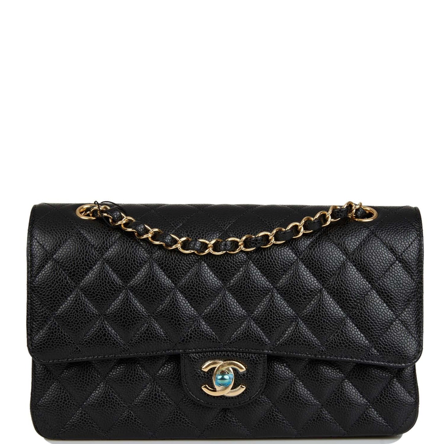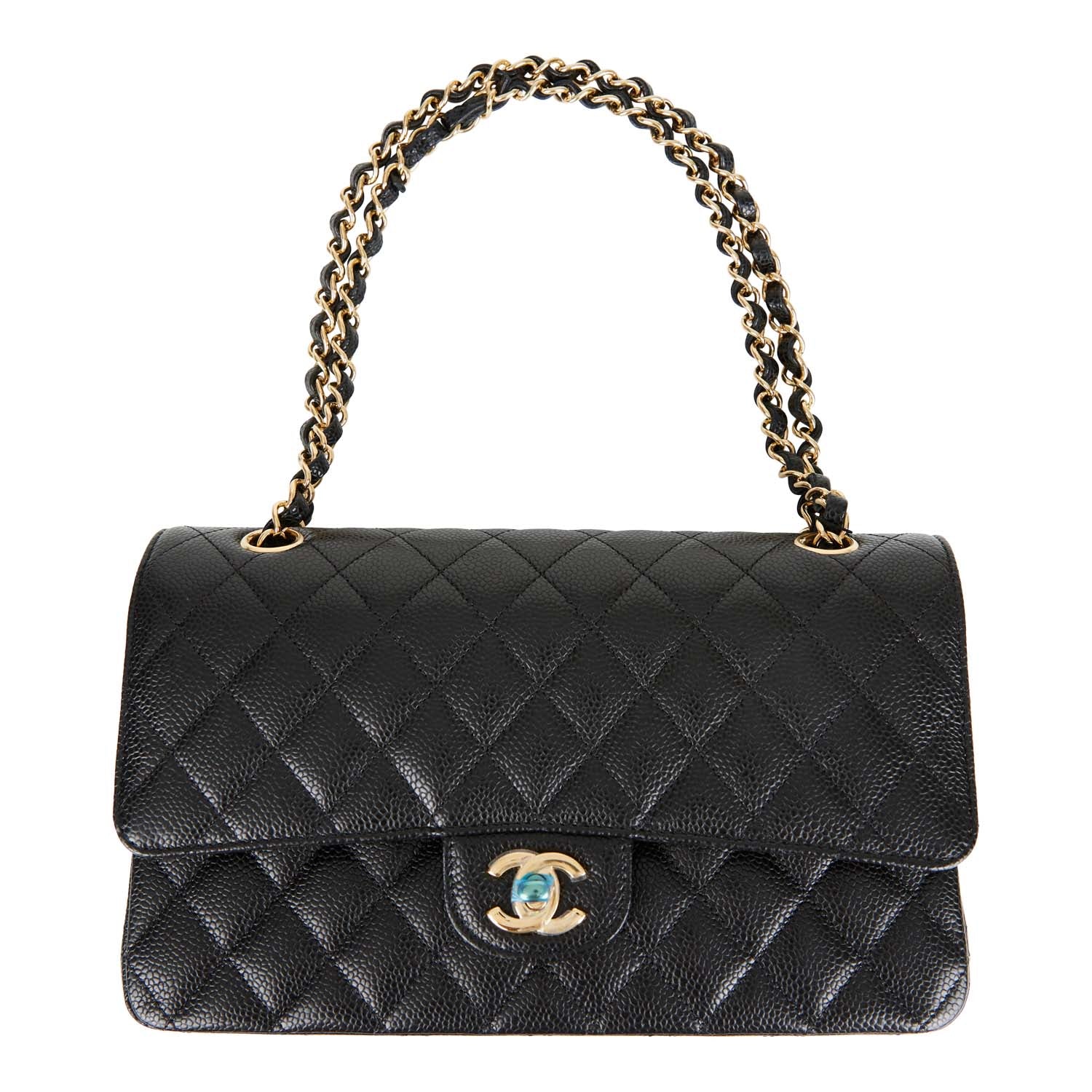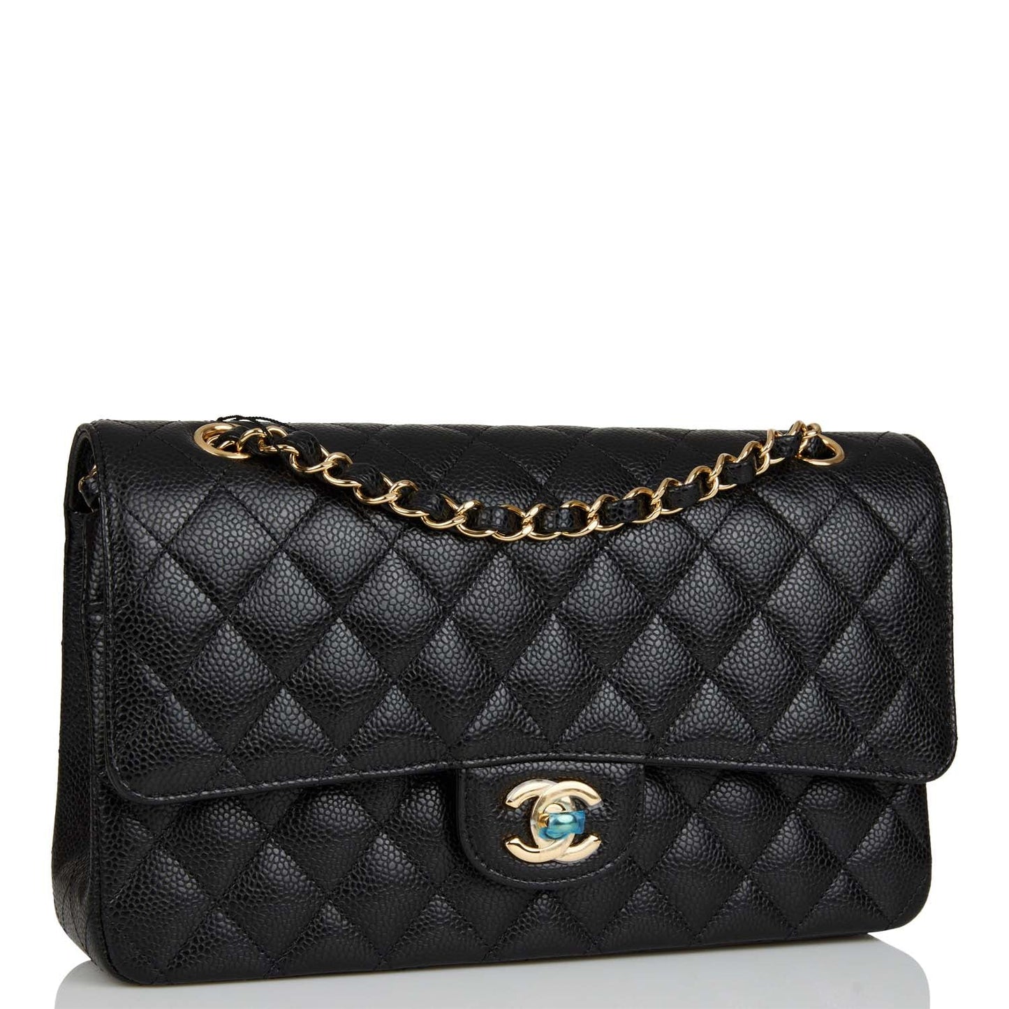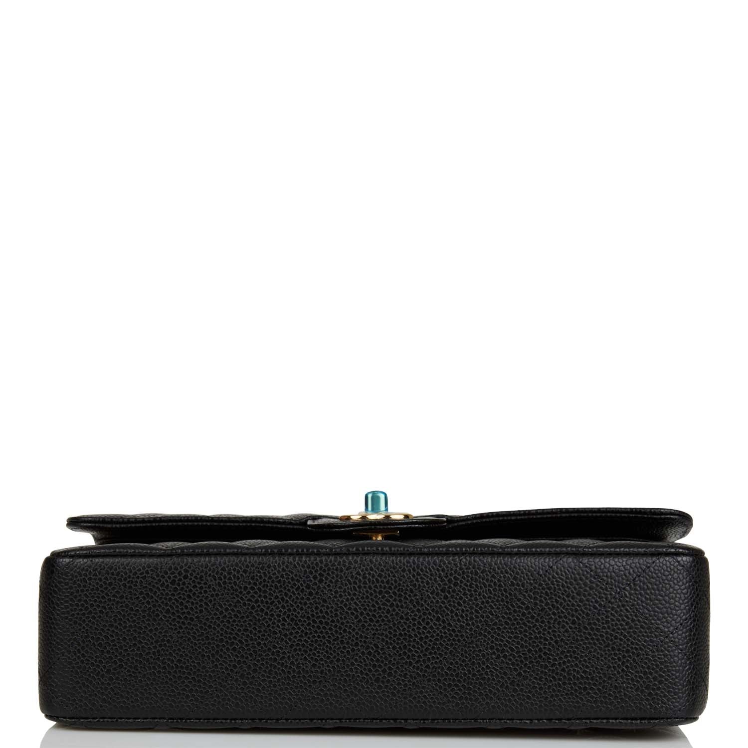 This Medium Classic Double Flap bag is in black caviar leather with gold tone hardware and features a front flap with signature CC turnlock closure, half moon back pocket, and adjustable interwoven gold tone chain link and black leather shoulder strap.