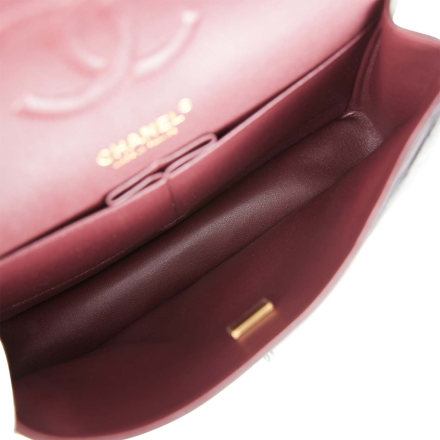 The interior is lined in burgundy leather with the "love letter" zipper compartment underneath the first flap, an "outer" slit pocket under the second flap, and an interior compartment with two open pockets separated by a "lipstick" compartment.