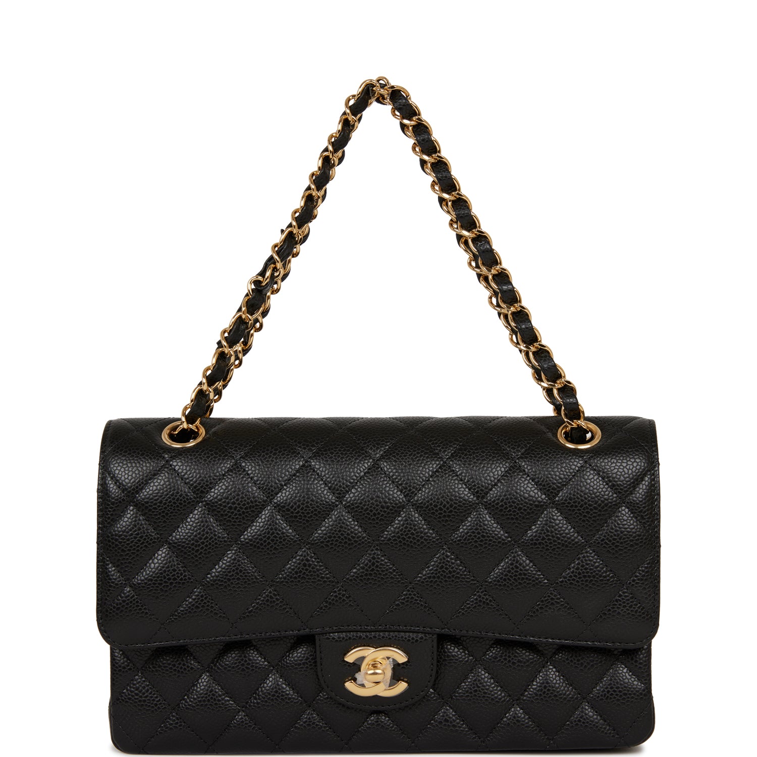 This Medium Classic Double Flap bag is in black caviar leather with gold tone hardware and features a front flap with signature CC turnlock closure, half moon back pocket, and adjustable interwoven gold tone chain link and black leather shoulder strap.