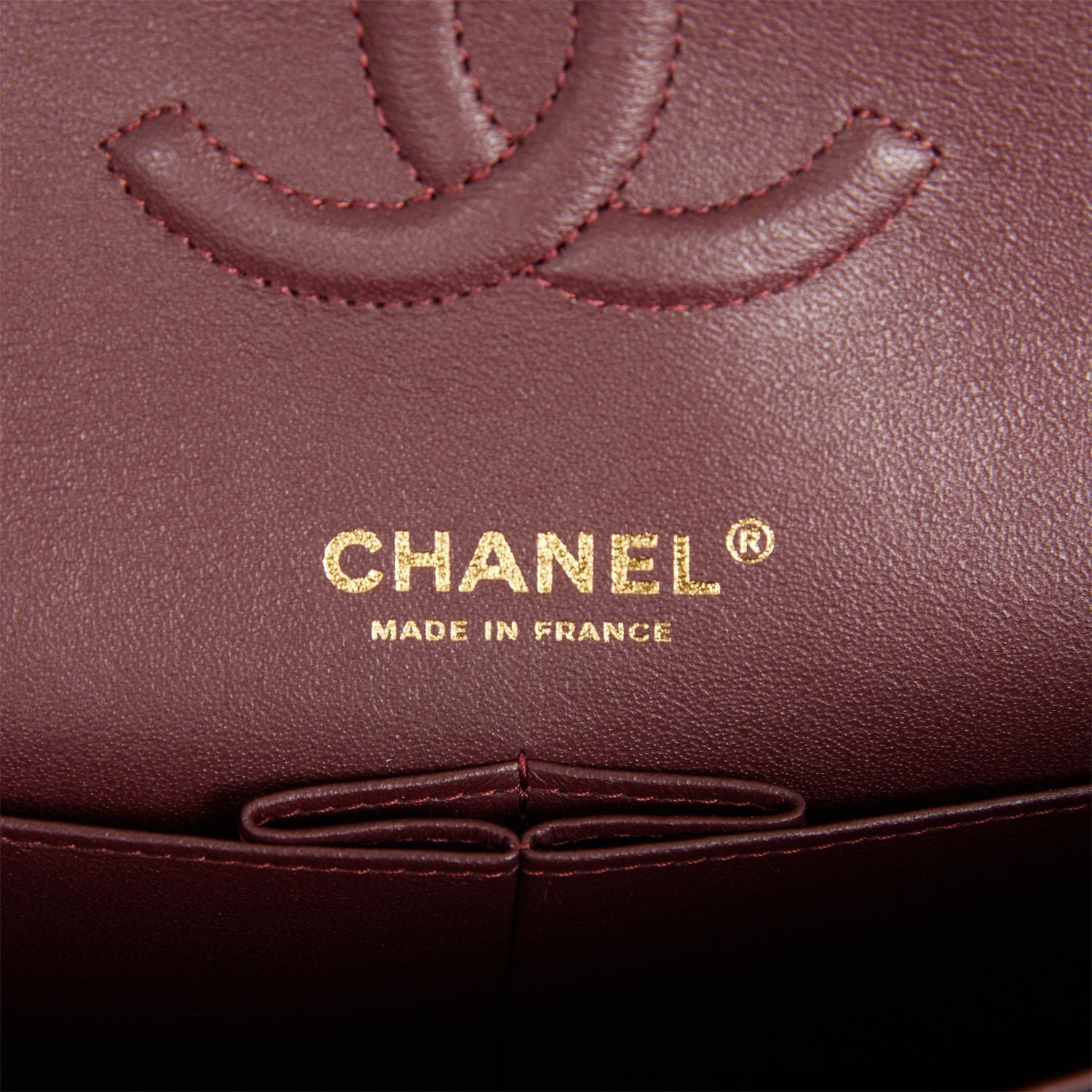 The interior is lined in burgundy leather with the "love letter" zipper compartment underneath the first flap, an "outer" slit pocket under the second flap, and an interior compartment with two open pockets separated by a "lipstick" compartment.