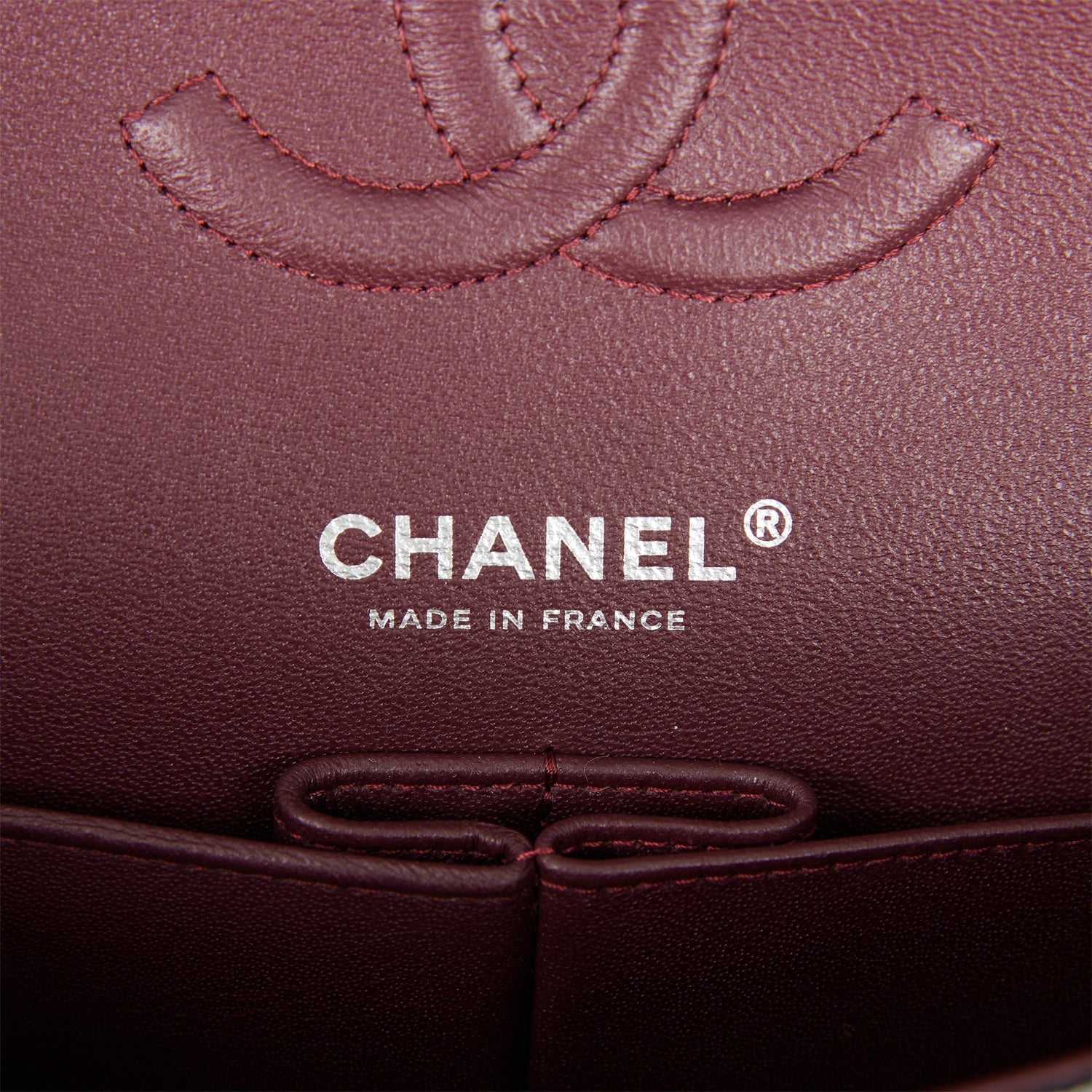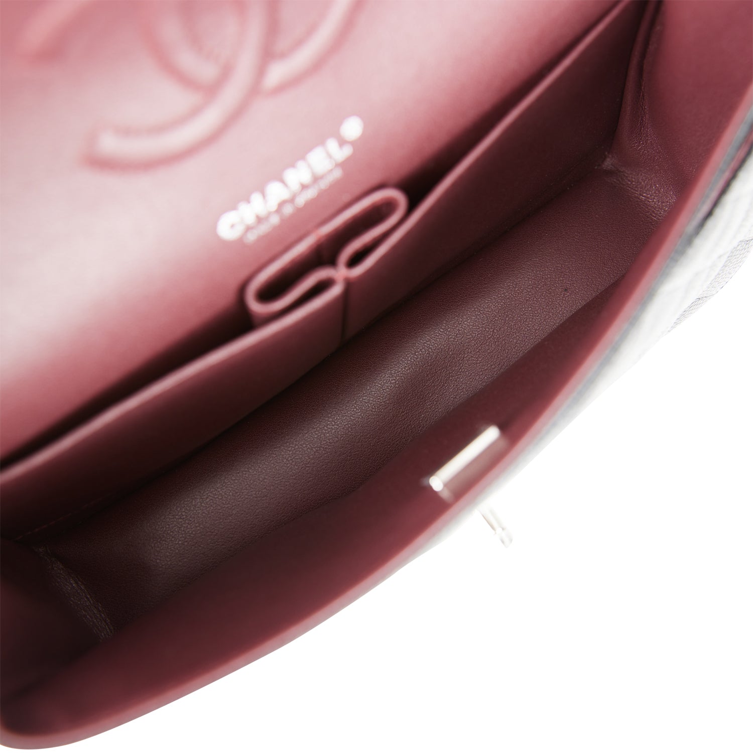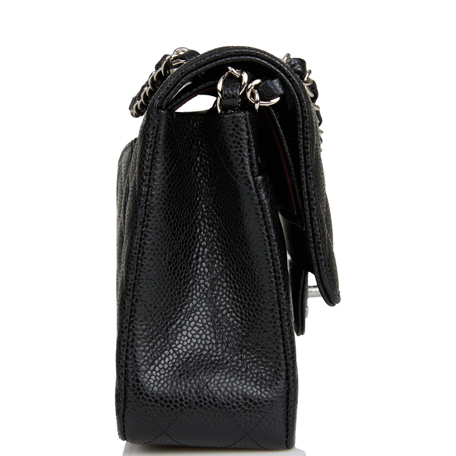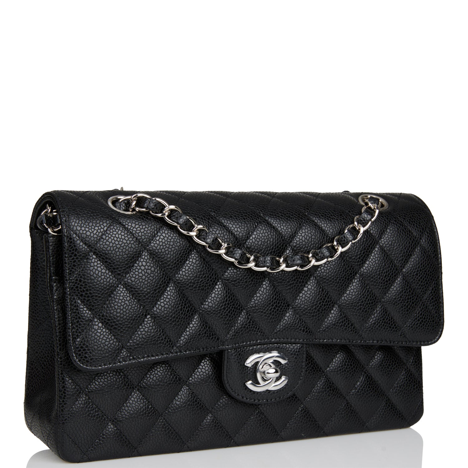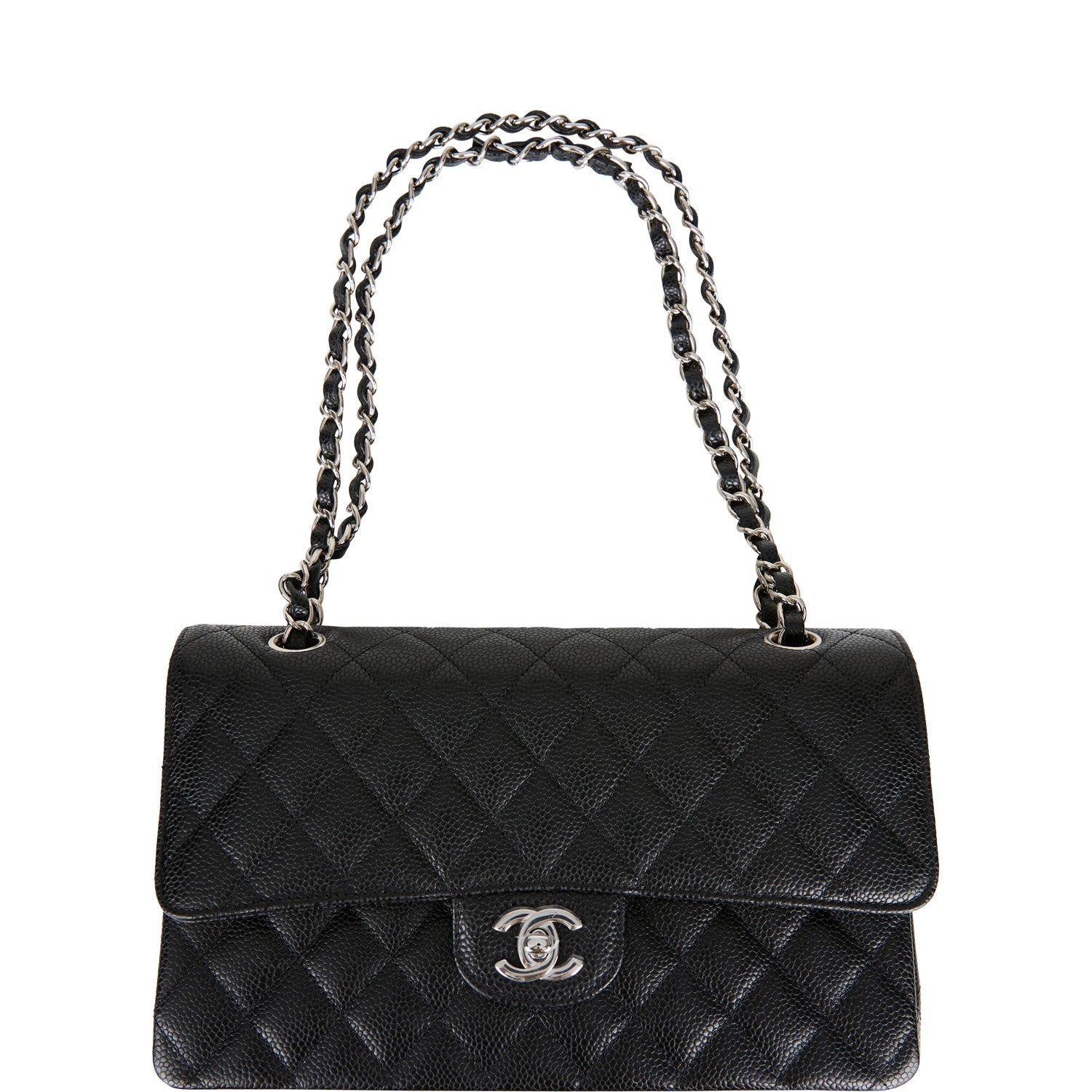 This Medium Classic Double Flap bag is in black caviar leather with silver tone hardware and features a front flap with signature CC turnlock closure, half moon back pocket, and adjustable interwoven silver tone chain link and black leather shoulder strap.