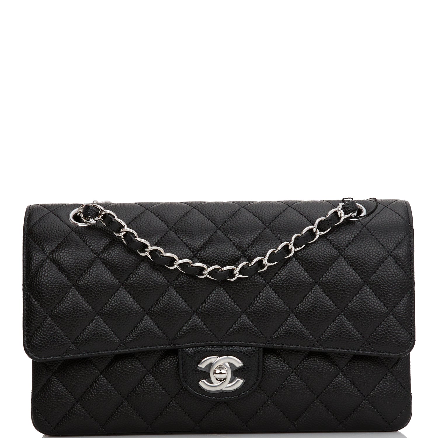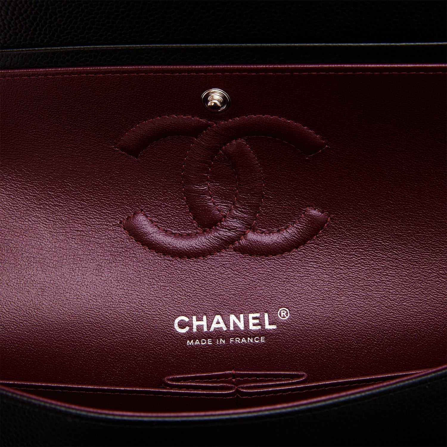 This Medium Classic Double Flap bag is in black caviar leather with silver tone hardware and features a front flap with signature CC turnlock closure, half moon back pocket, and adjustable interwoven silver tone chain link and black leather shoulder strap.