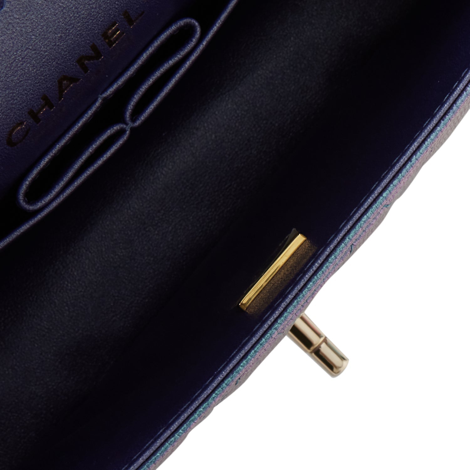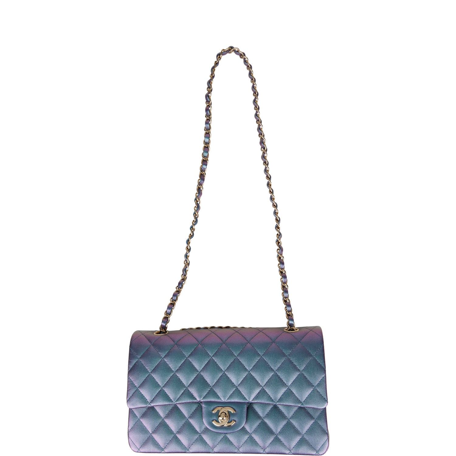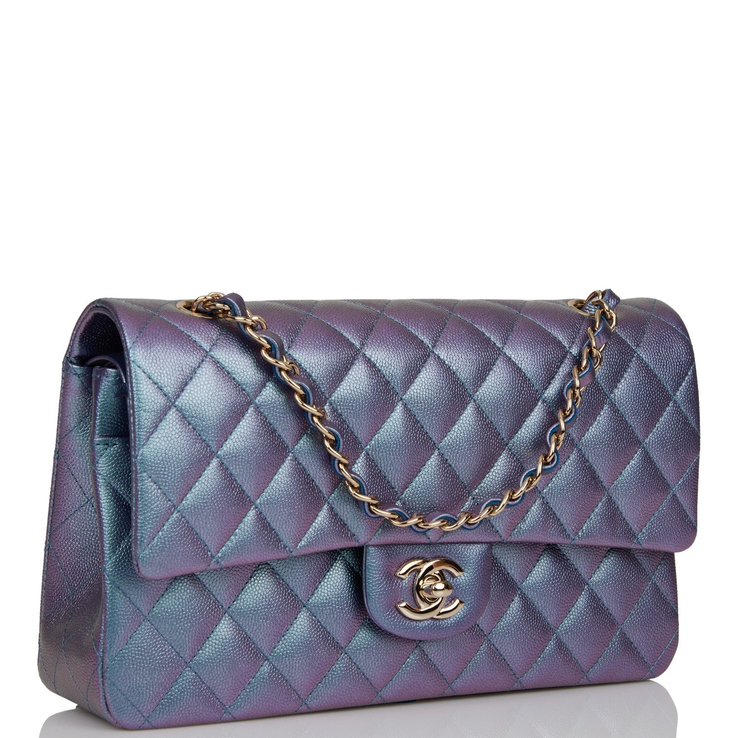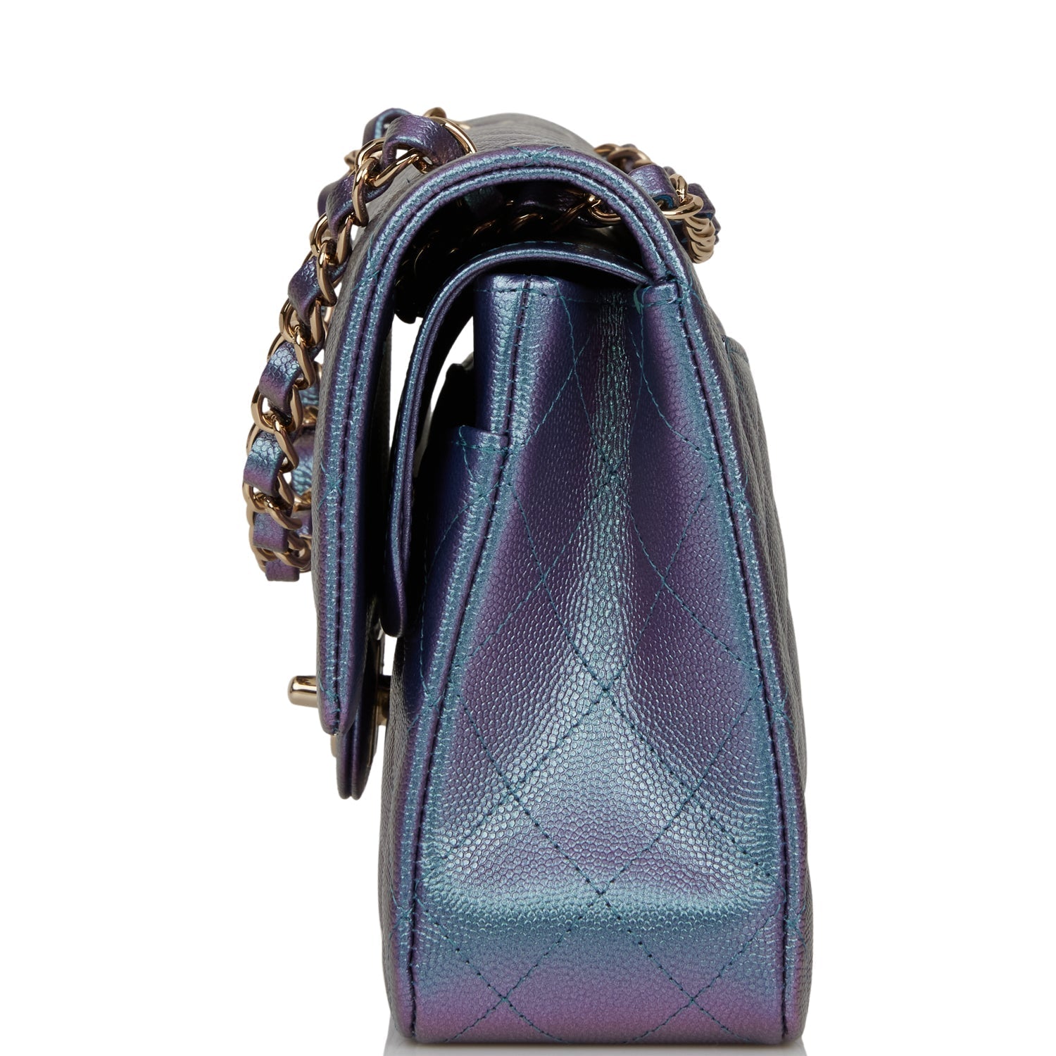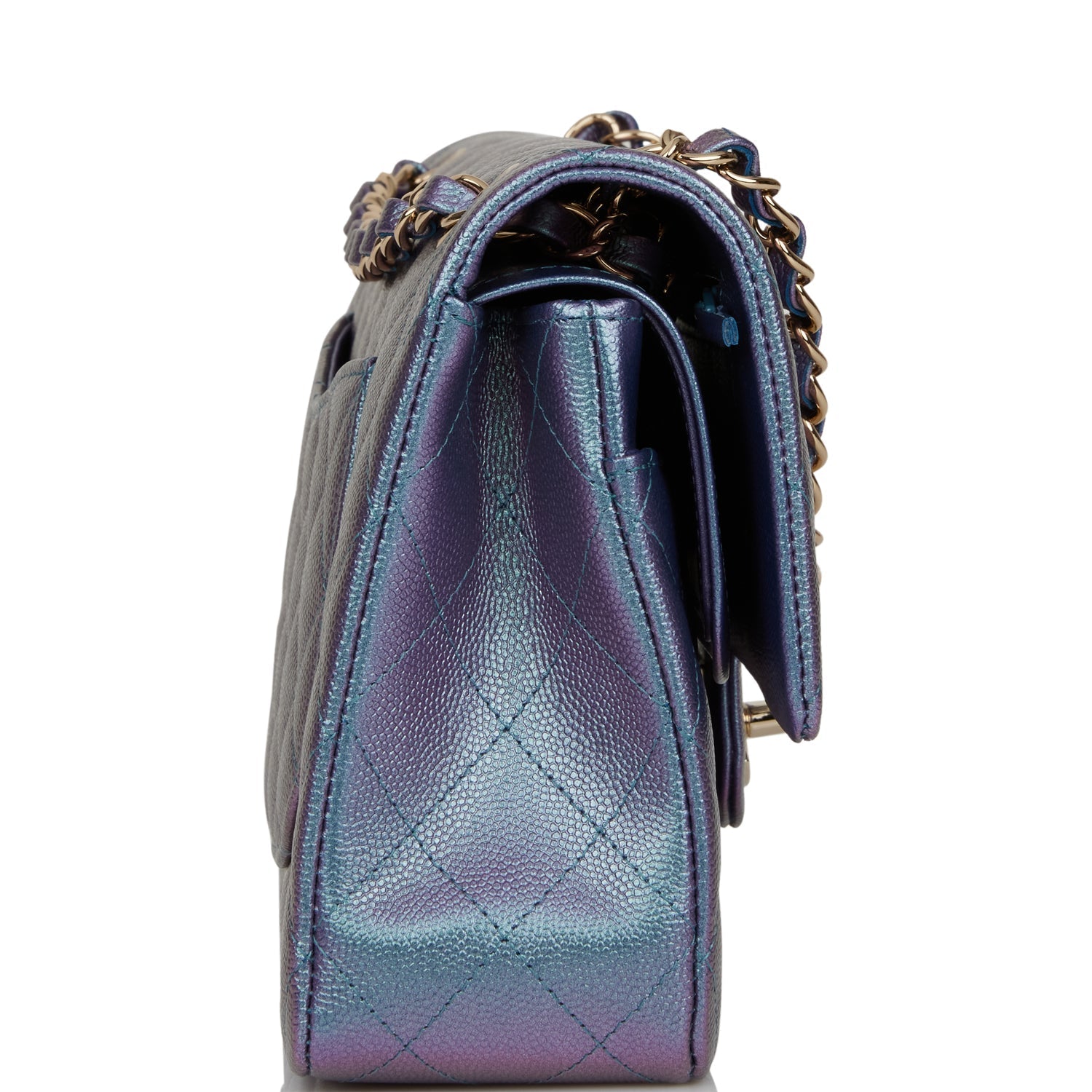 This Medium Classic Double Flap bag is in blue iridescent caviar leather with light gold tone hardware and features a front flap with signature CC turnlock closure, half moon back pocket, and adjustable interwoven light gold tone chain link and blue iridescent leather shoulder strap.