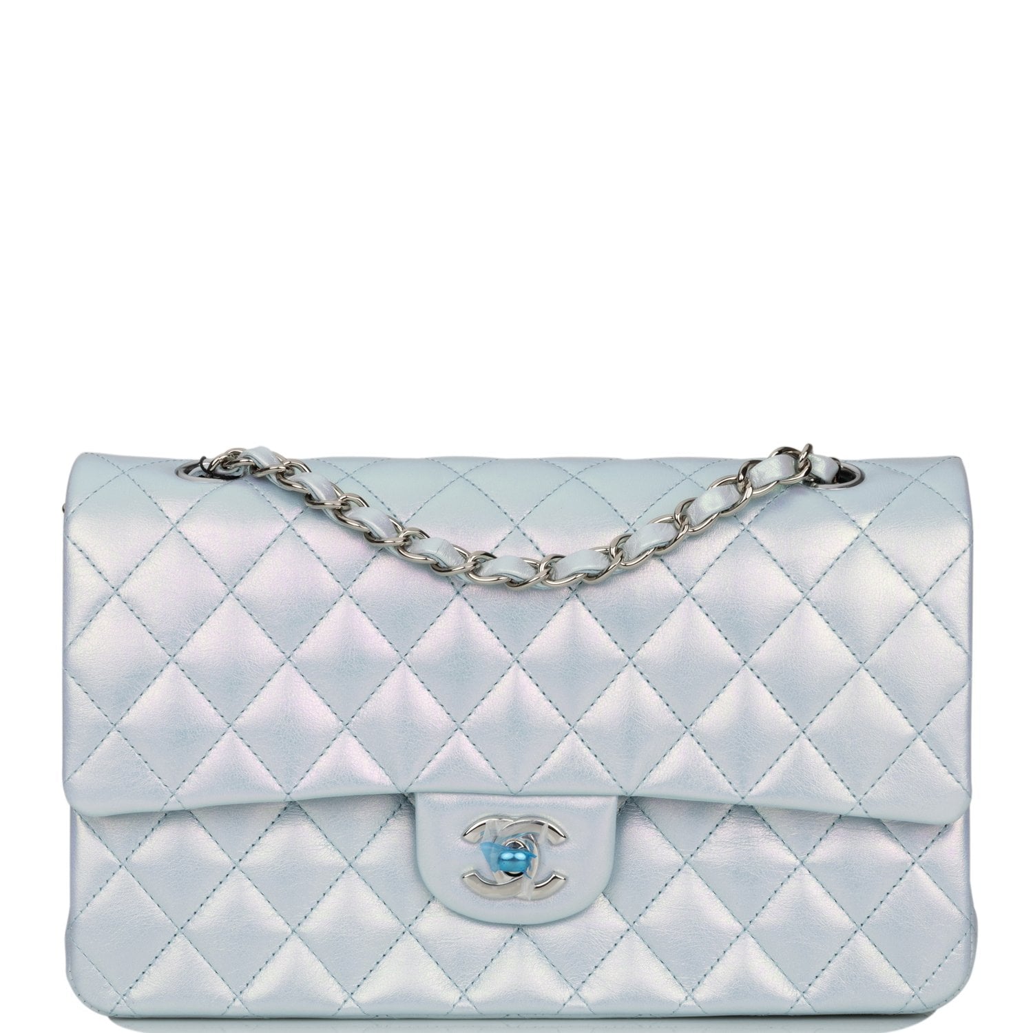This Medium Classic Double Flap bag is in blue iridescent lambskin leather with silver tone hardware and features a front flap with signature CC turnlock closure, half moon back pocket, and adjustable interwoven silver tone chain link and blue leather shoulder strap.