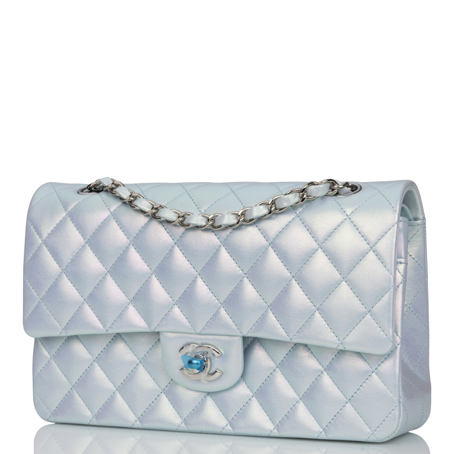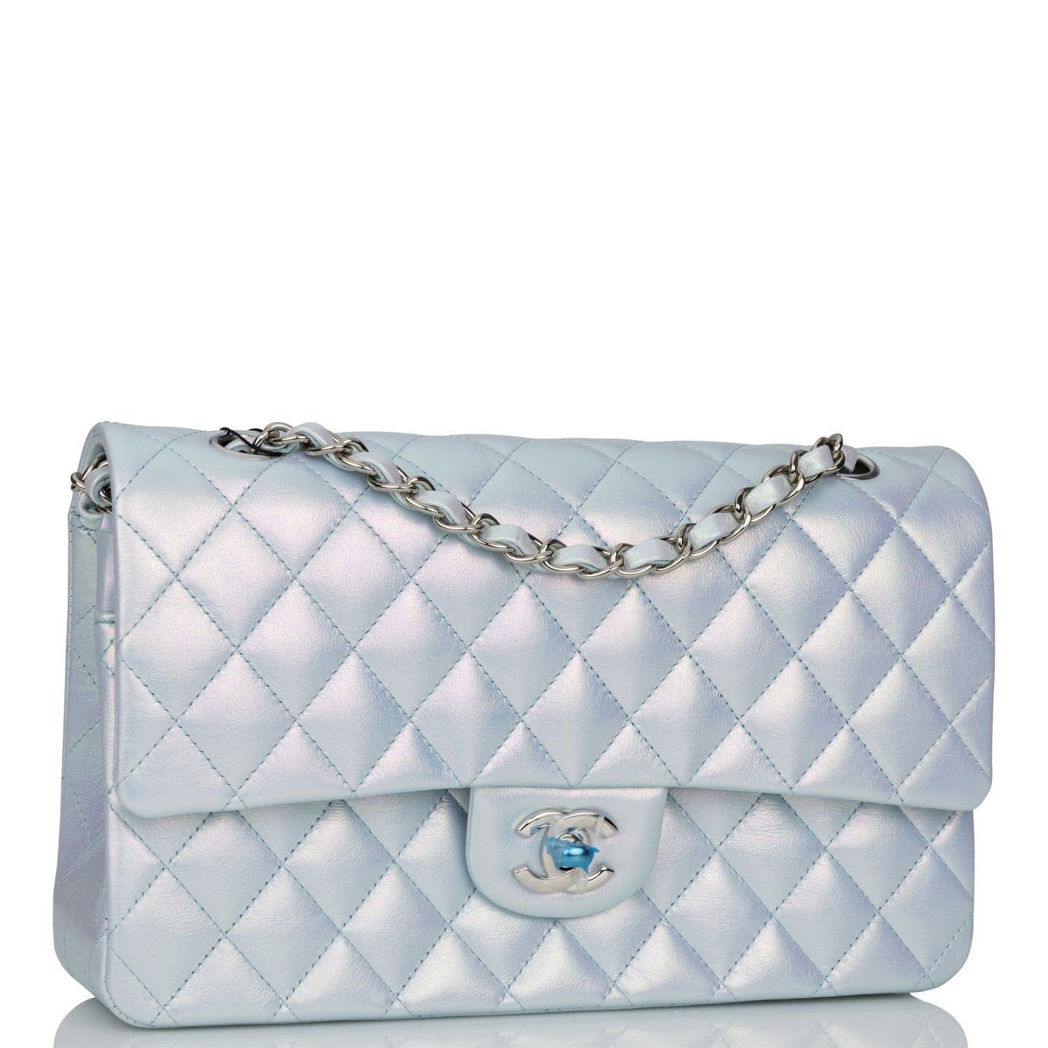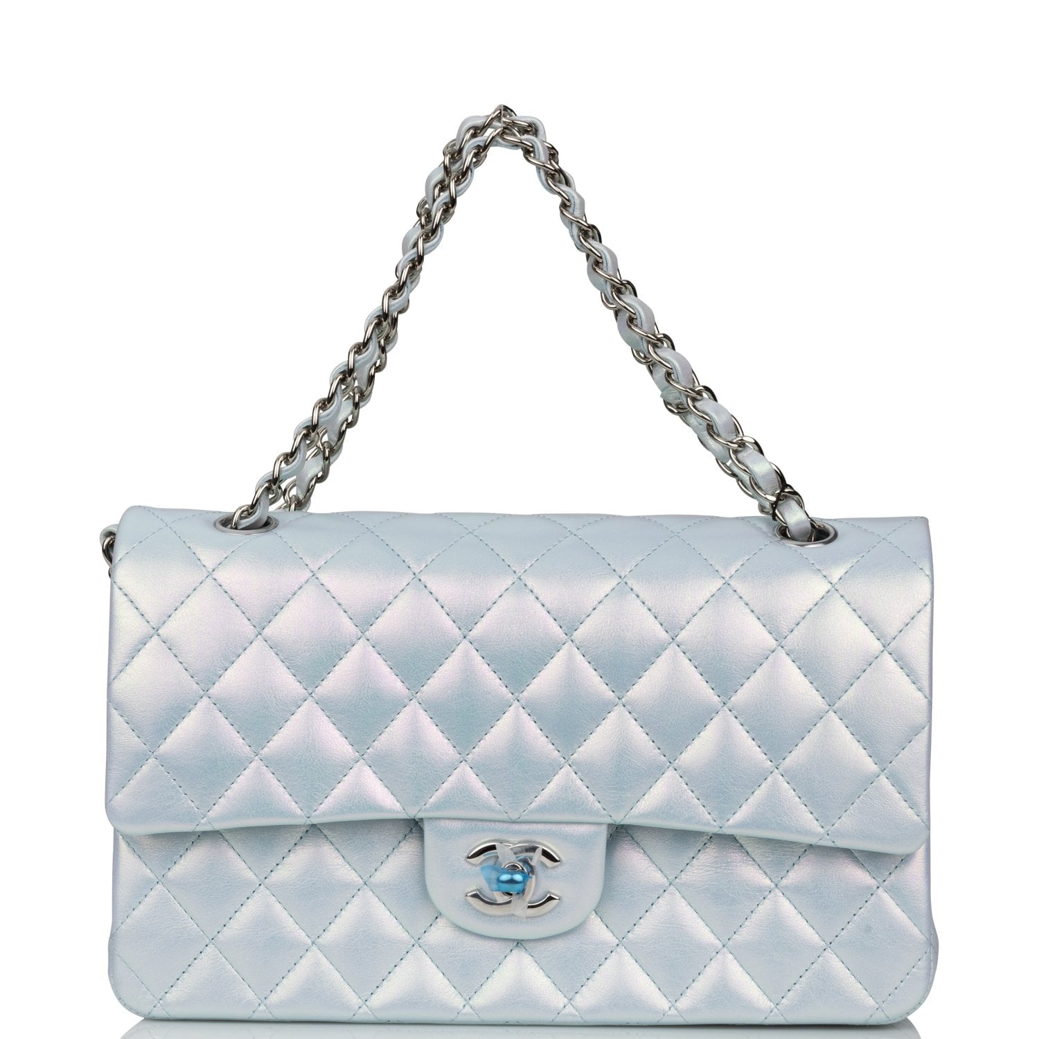 Chanel Medium Classic Double Flap Bag Blue Iridescent Lambskin Silver Hardware
