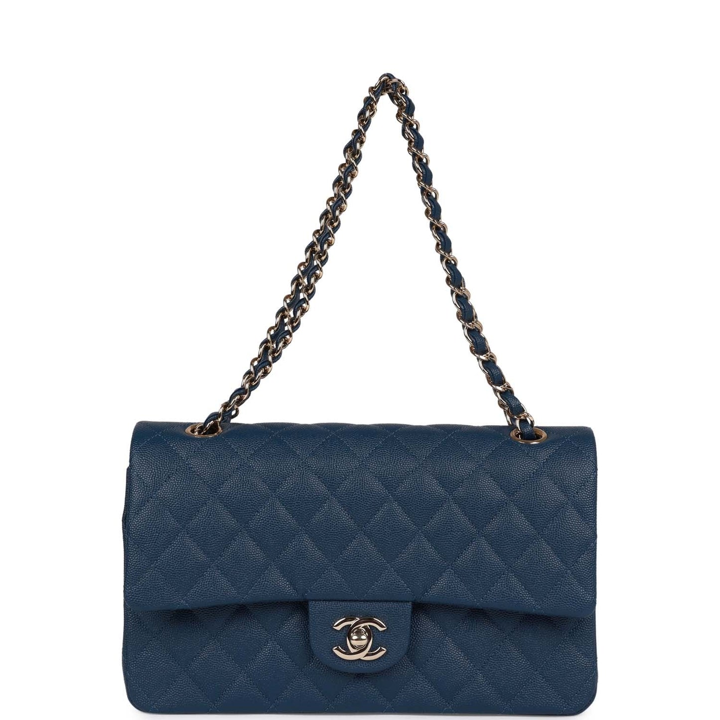 This Chanel Medium Classic Double Flap bag is in blue caviar leather with light gold tone hardware and features a front flap with signature CC turnlock closure, half moon back pocket, and adjustable interwoven light gold tone chain link and blue caviar leather shoulder strap.