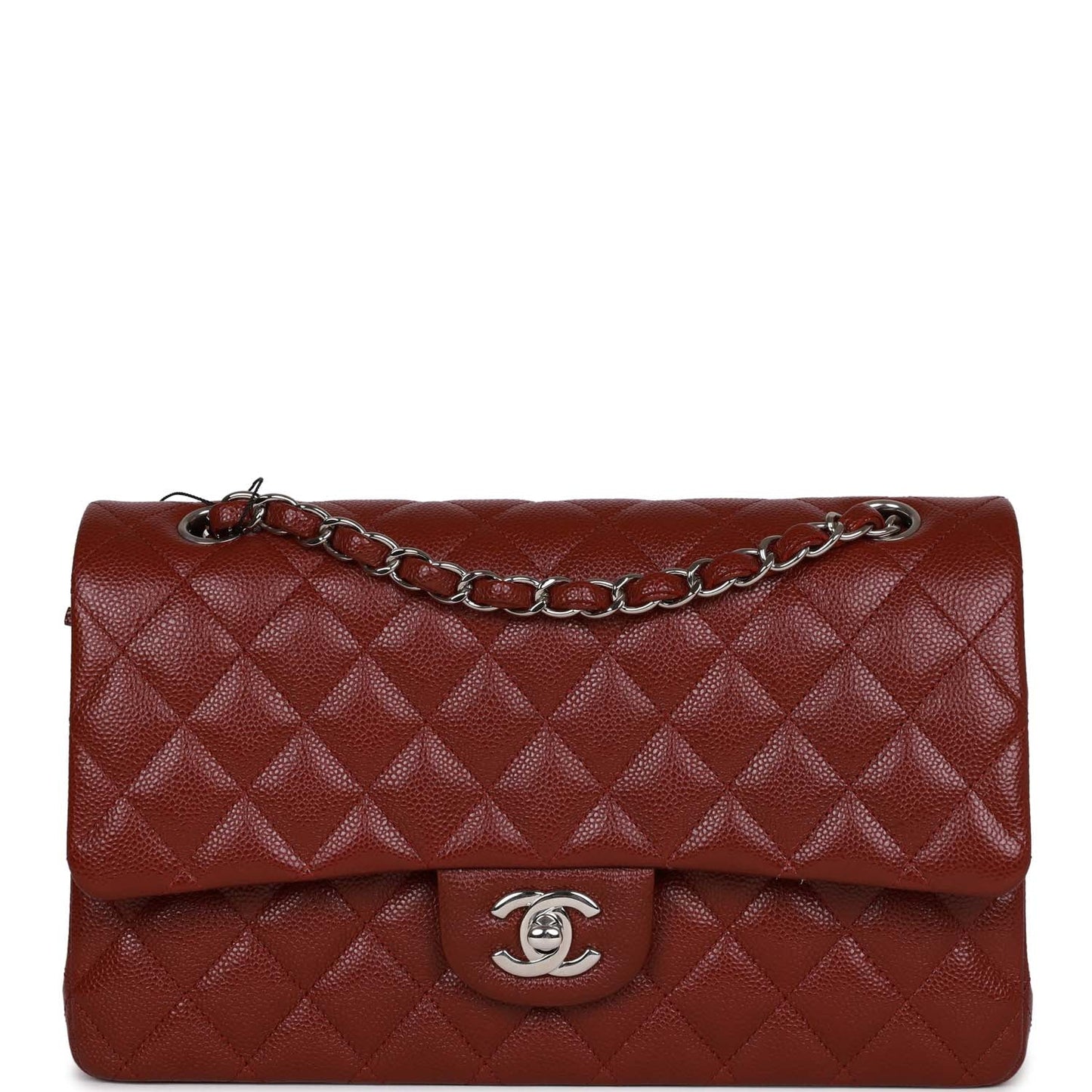 This Medium Classic Double Flap bag is in Burgundy caviar leather with silver tone hardware and features a front flap with signature CC turnlock closure, half moon back pocket, and adjustable interwoven silver tone chain link and burgundy leather shoulder strap.