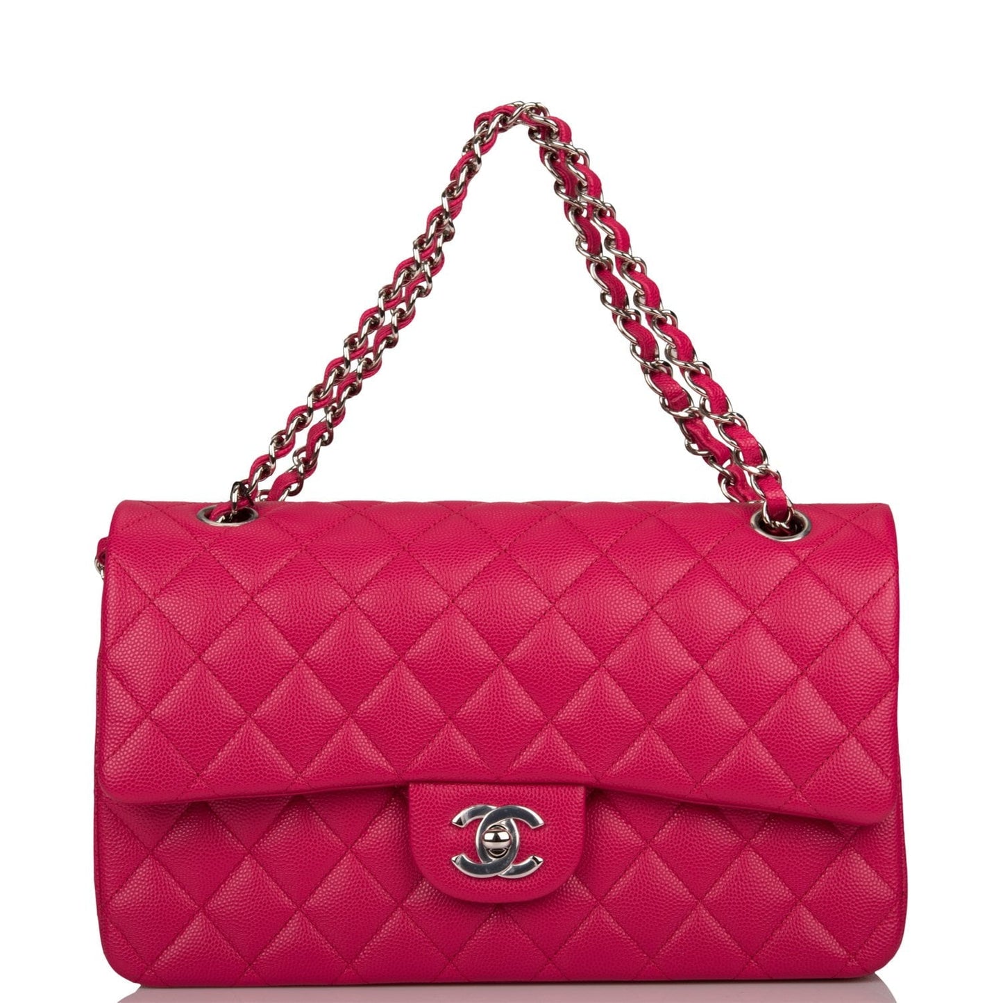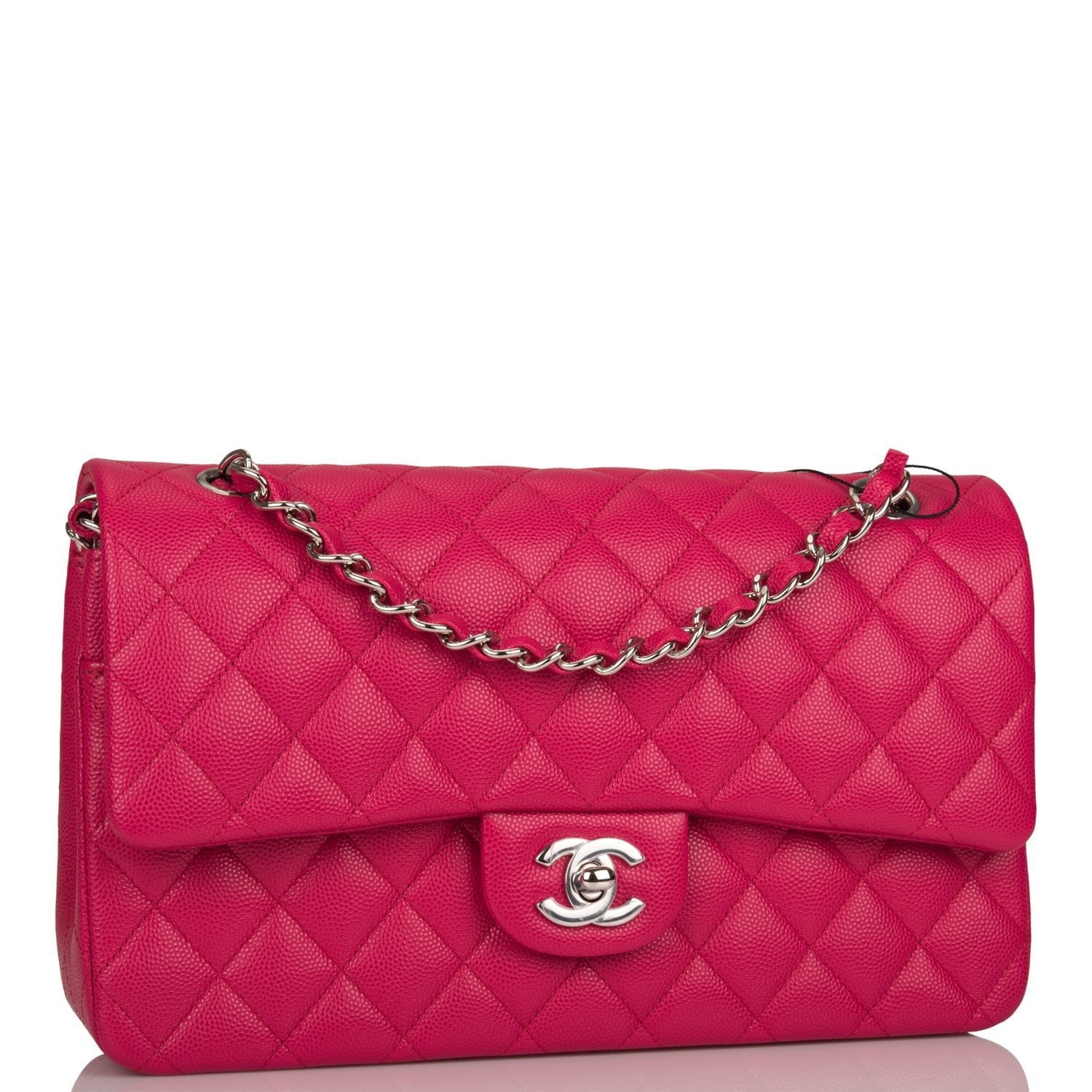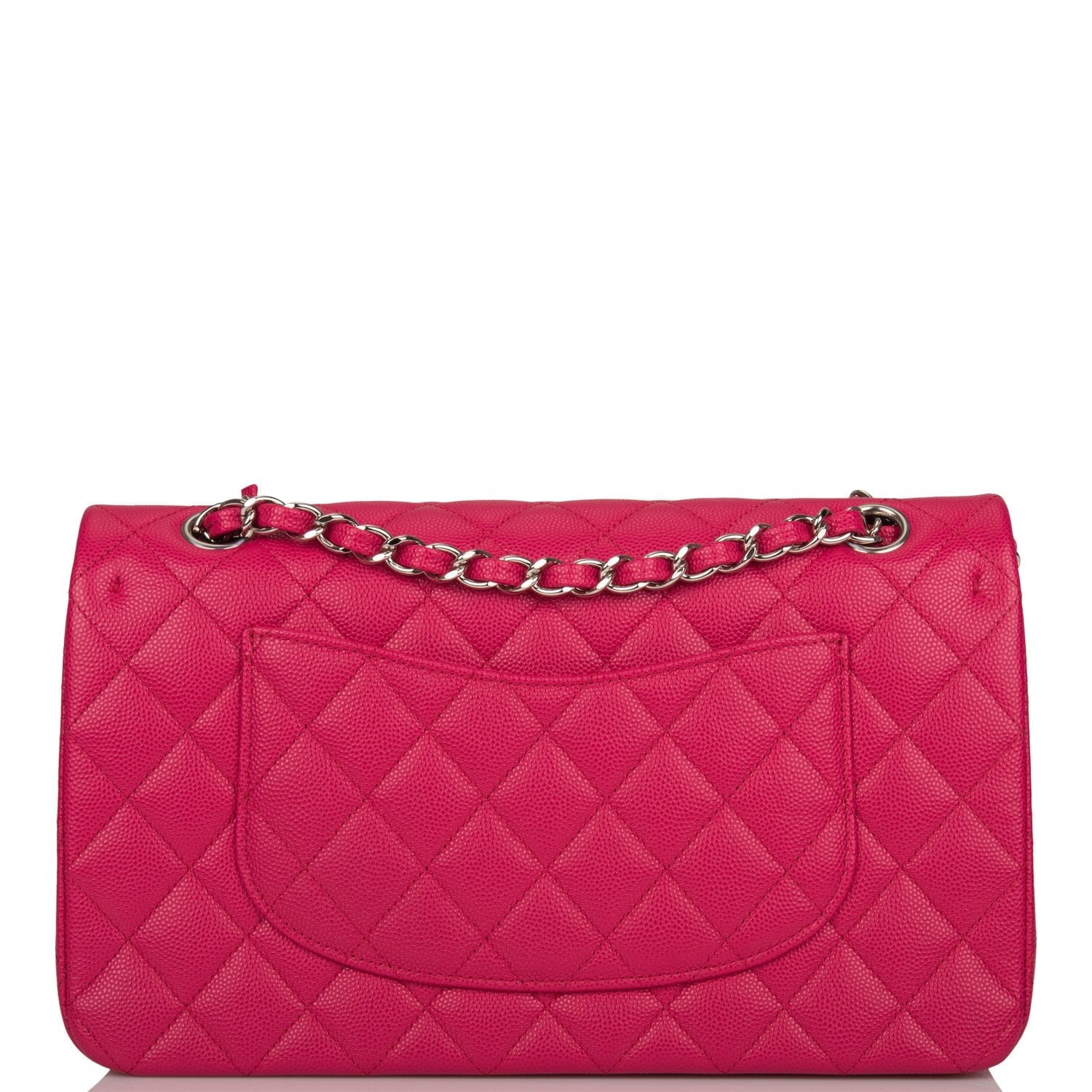 This Medium Classic Double Flap bag is in dark pink caviar leather with silver tone hardware and features a front flap with signature CC turnlock closure, half moon back pocket, and adjustable interwoven silver tone chain link and dark pink leather shoulder strap.