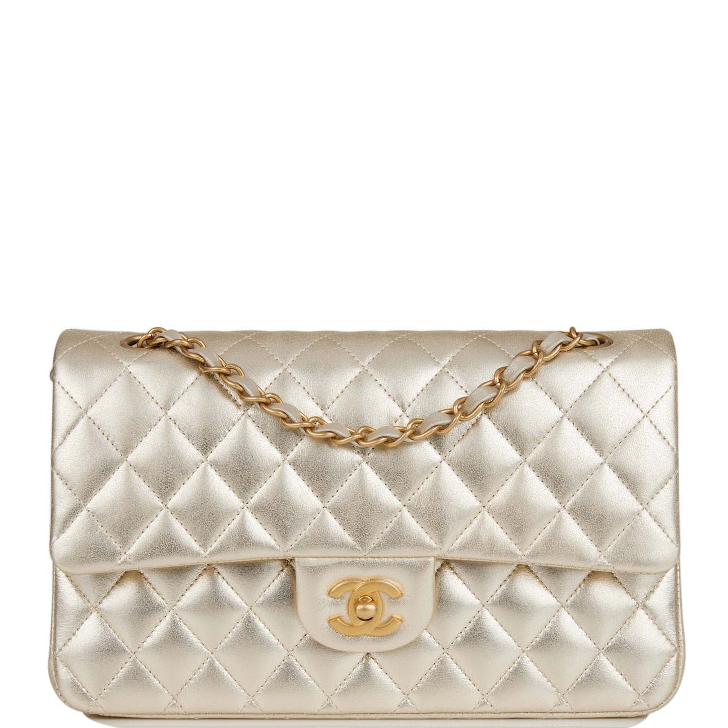 This Medium Classic Double Flap bag is in iridescent gold lambskin leather with antique gold tone hardware and features a front flap with signature CC turnlock closure, half moon back pocket, and adjustable interwoven antique gold tone chain link and iridescent gold leather shoulder strap.