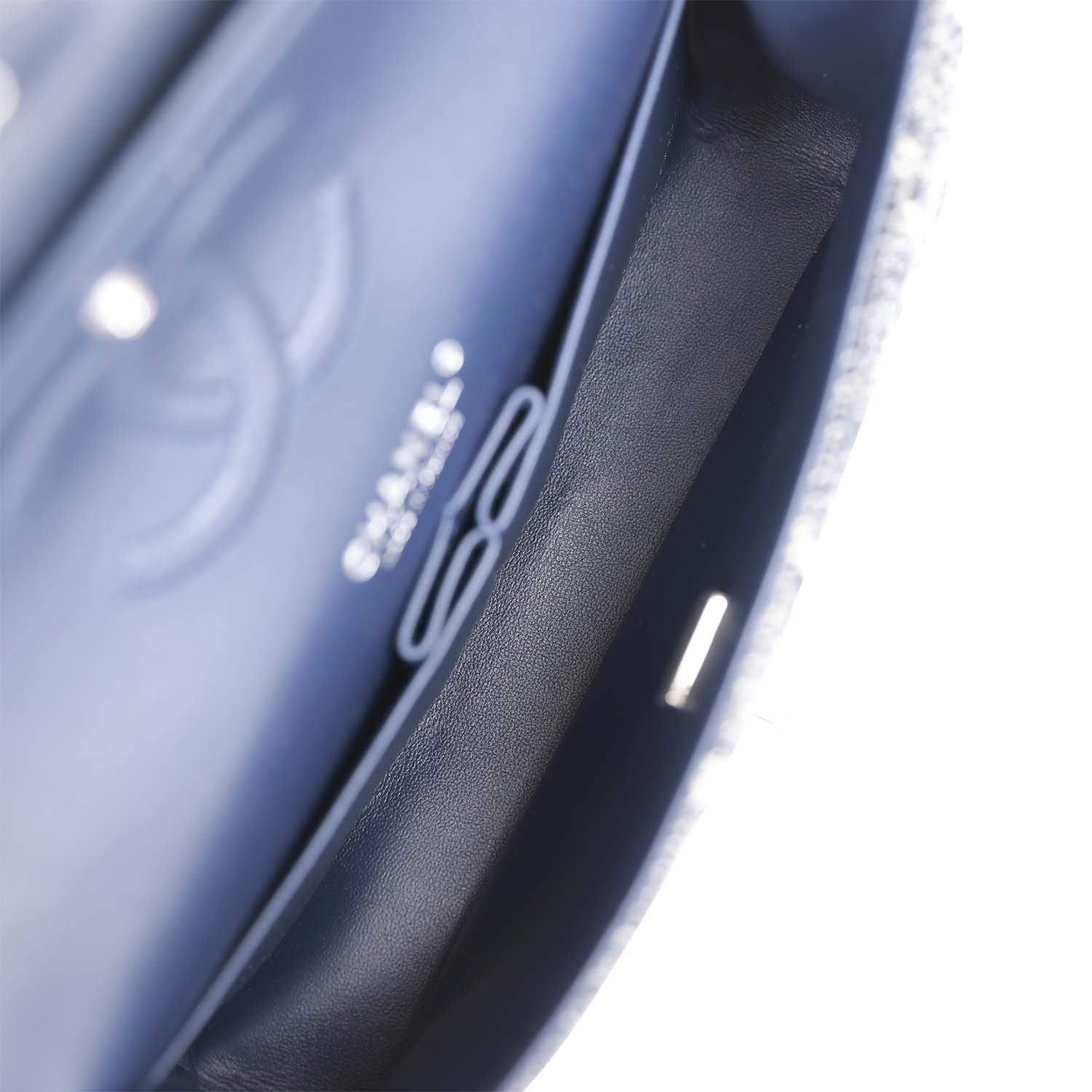 This Medium Classic Double Flap bag is in Navy tweed with silver tone hardware and features a front flap with signature CC turnlock closure, half moon back pocket, and adjustable interwoven silver tone chain link and navy leather shoulder strap.