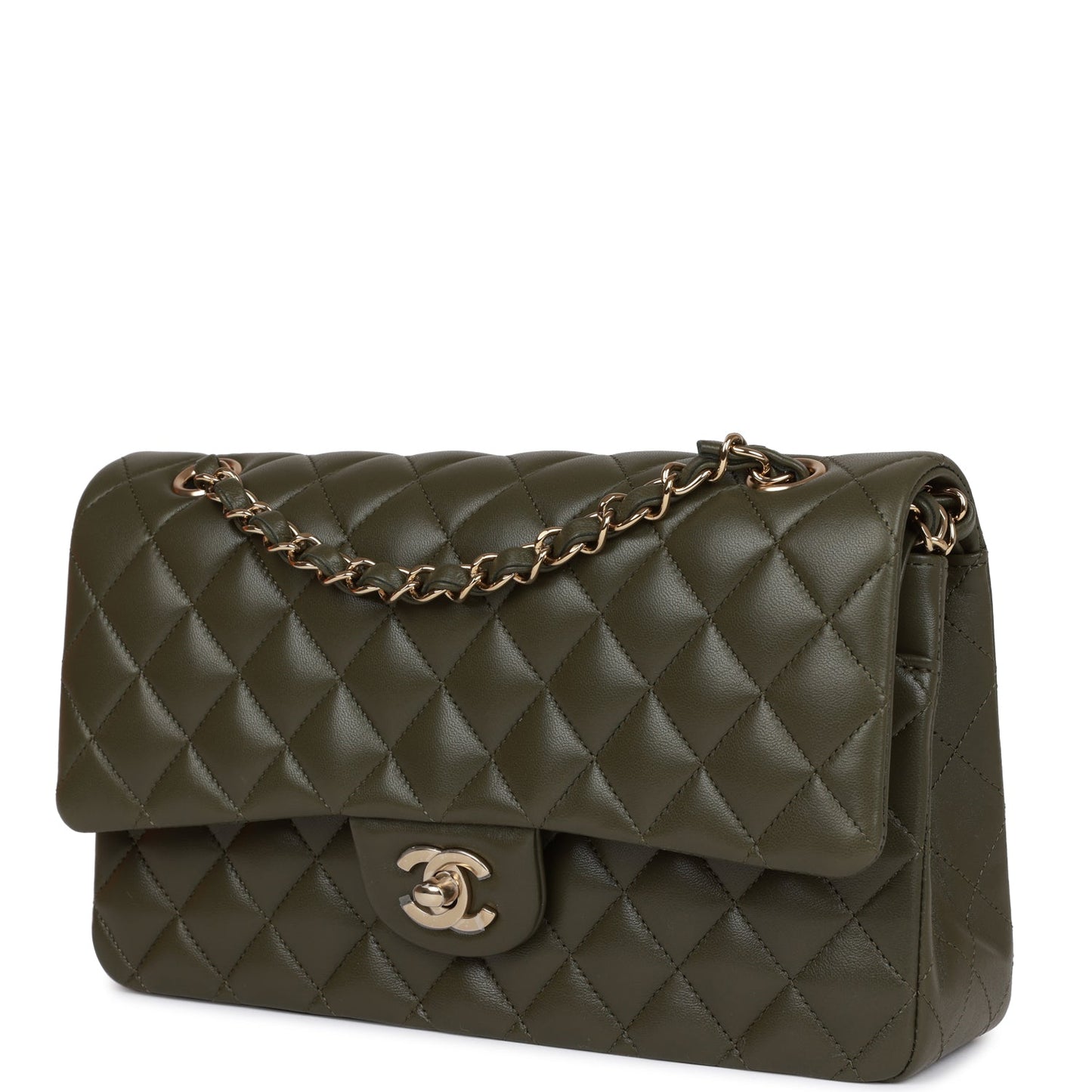 This Medium Classic Double Flap bag is in Olive calfskin leather with light gold tone hardware and features a front flap with signature CC turnlock closure, half moon back pocket, and adjustable interwoven light gold tone chain link and olive leather shoulder strap.