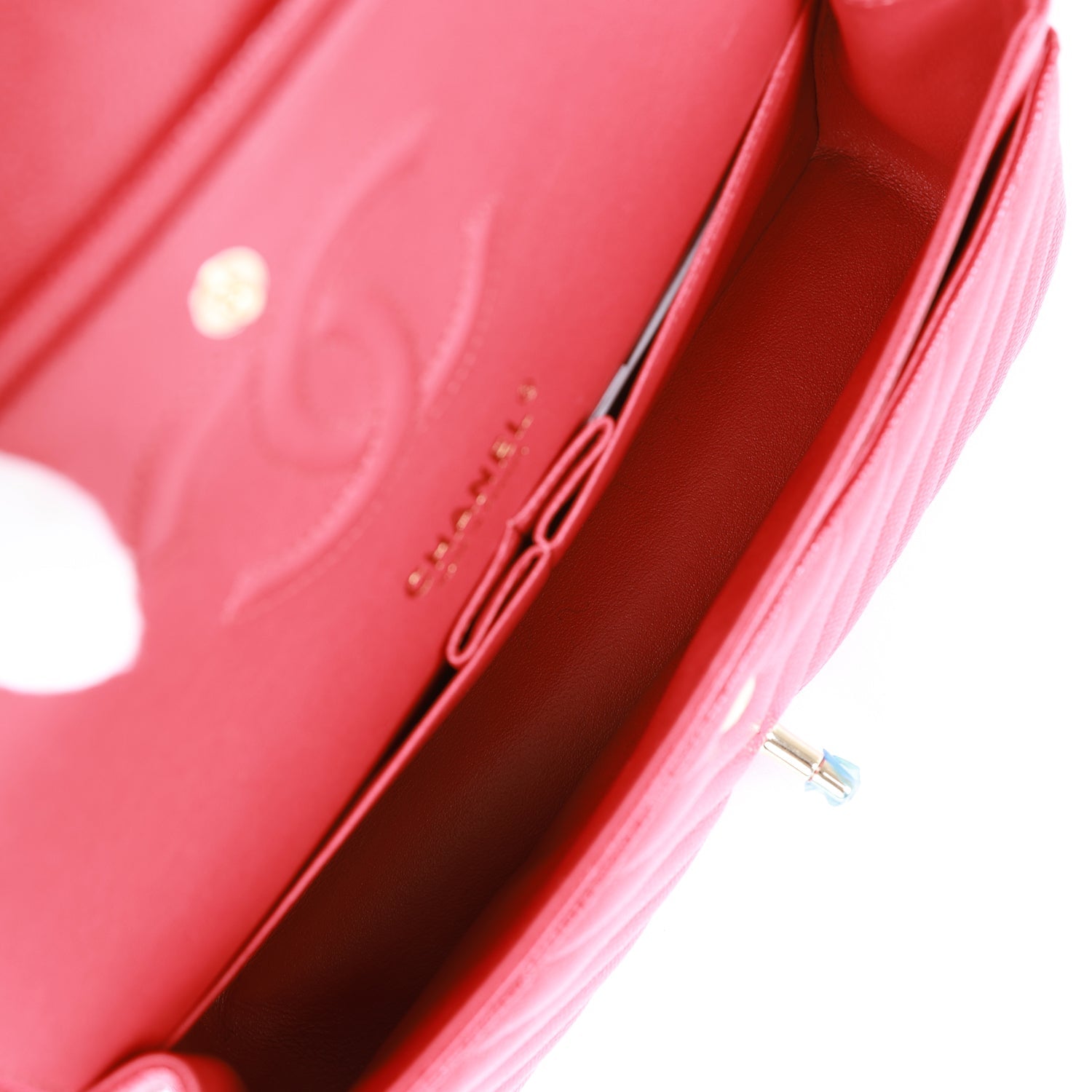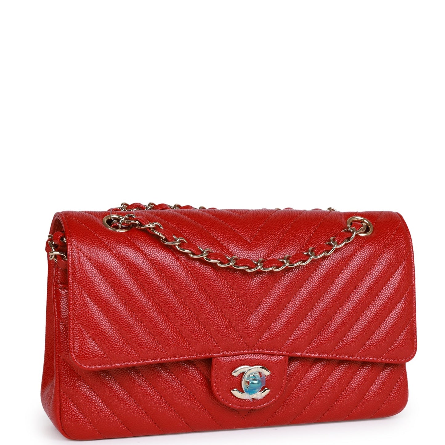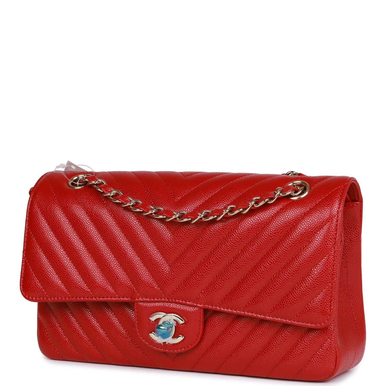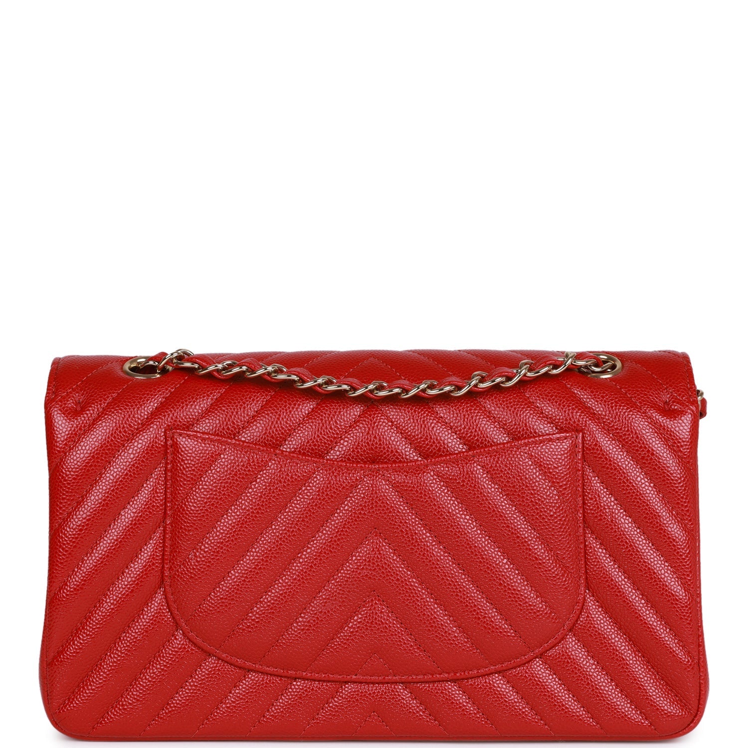 This Medium Classic Double Flap bag is in red chevron caviar leather with light gold tone hardware and features a front flap with signature CC turnlock closure, half moon back pocket, and adjustable interwoven light gold tone chain link and red leather shoulder strap.