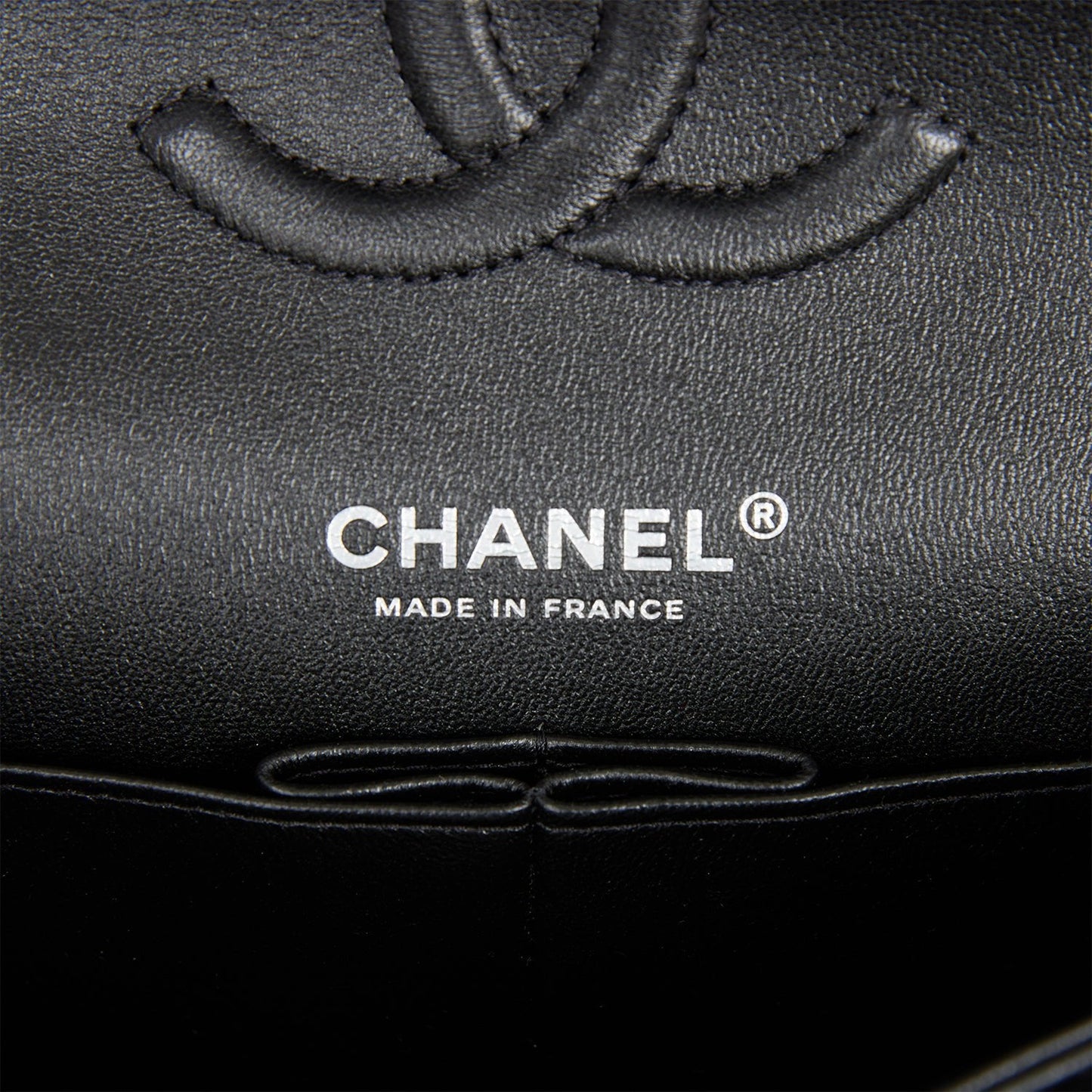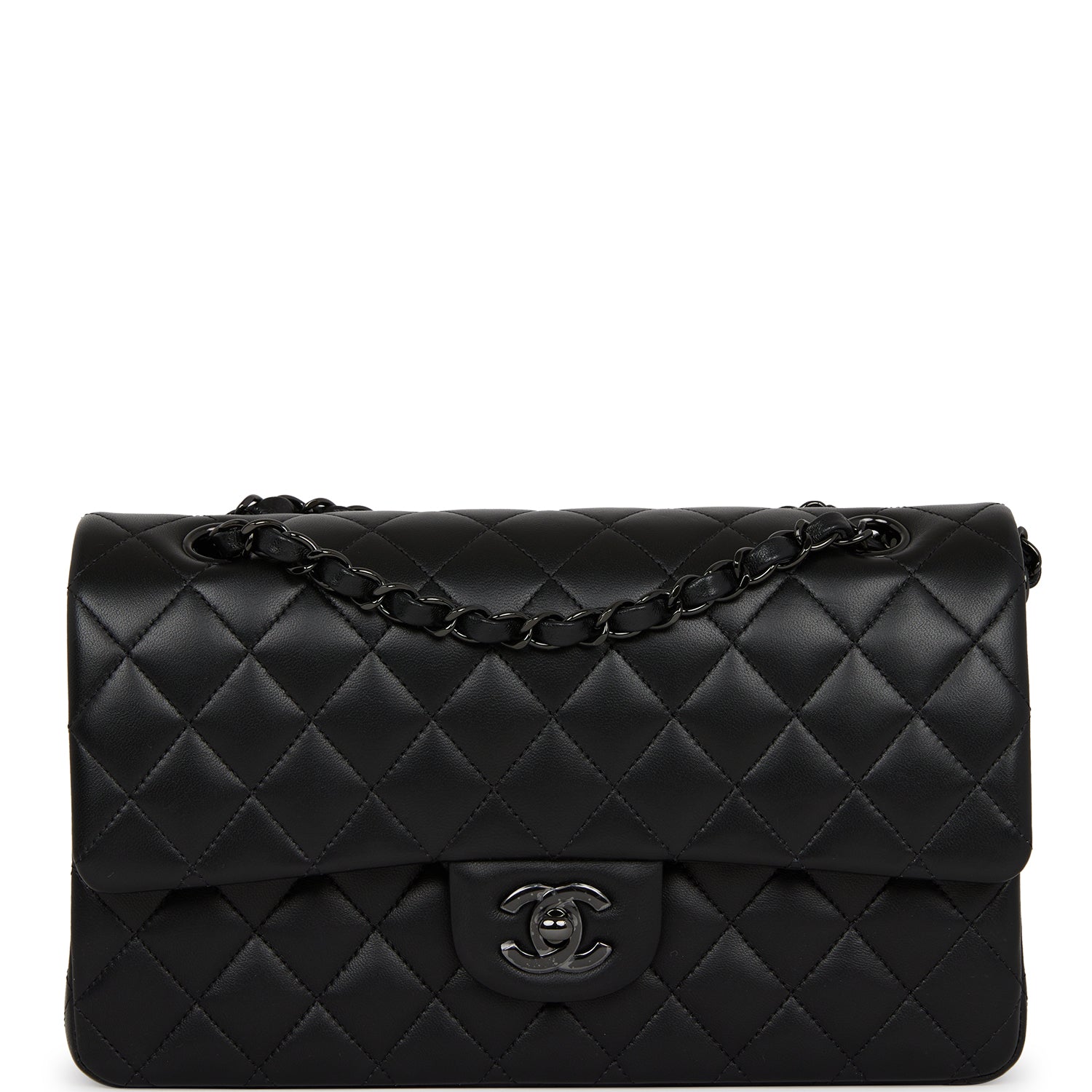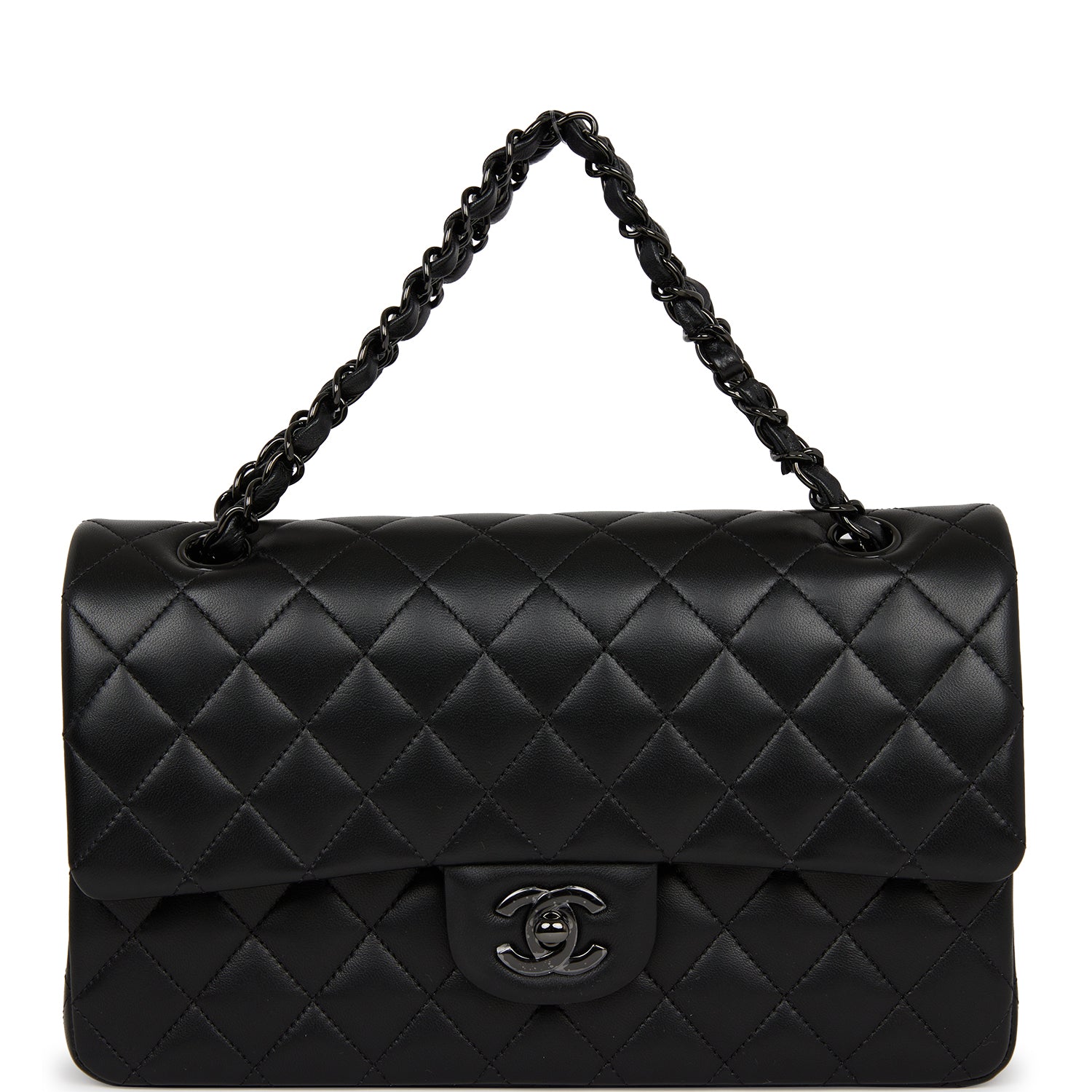 This Medium Classic Double Flap bag is in black lambskin leather with black hardware and features a front flap with signature CC turnlock closure, half moon back pocket, and adjustable interwoven black chain link and black leather shoulder strap.