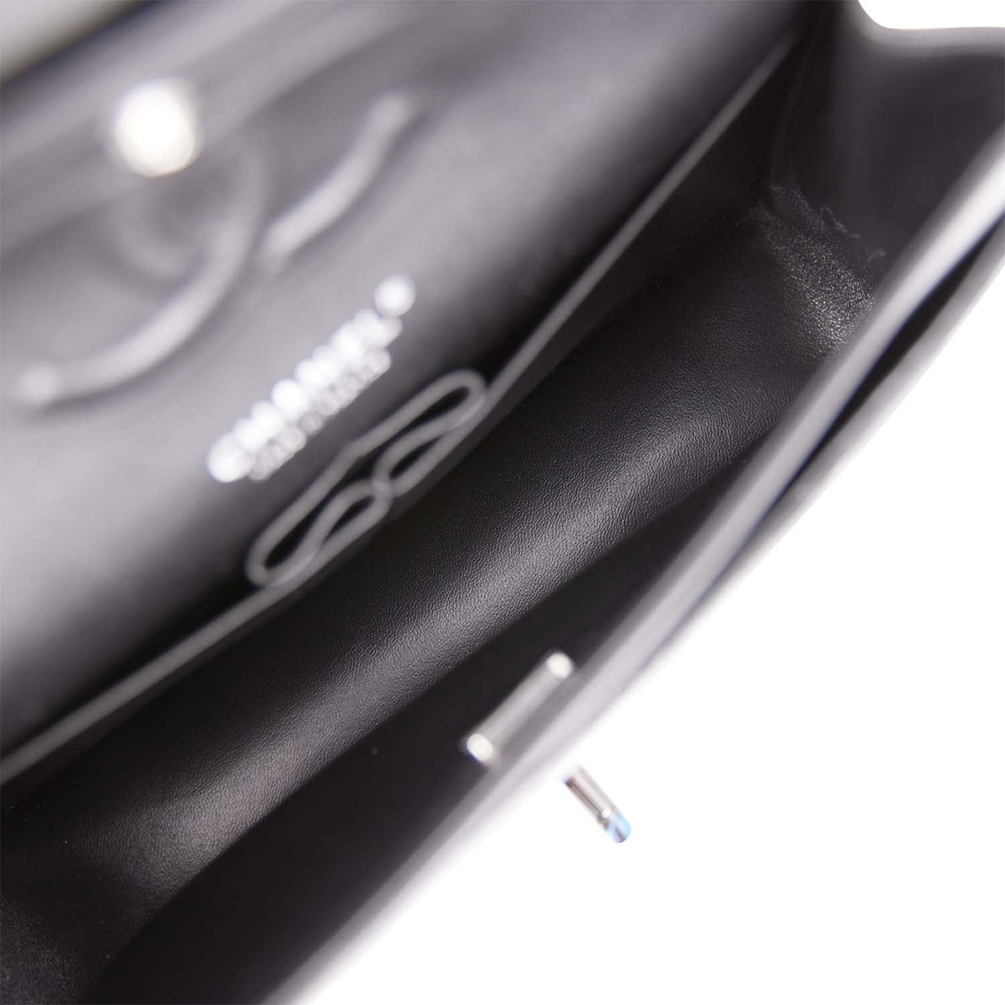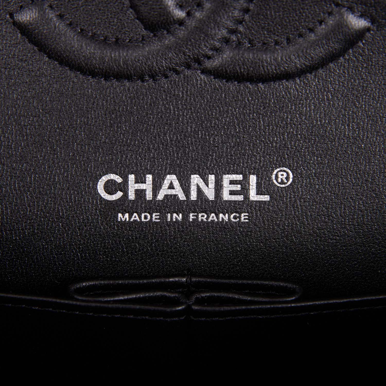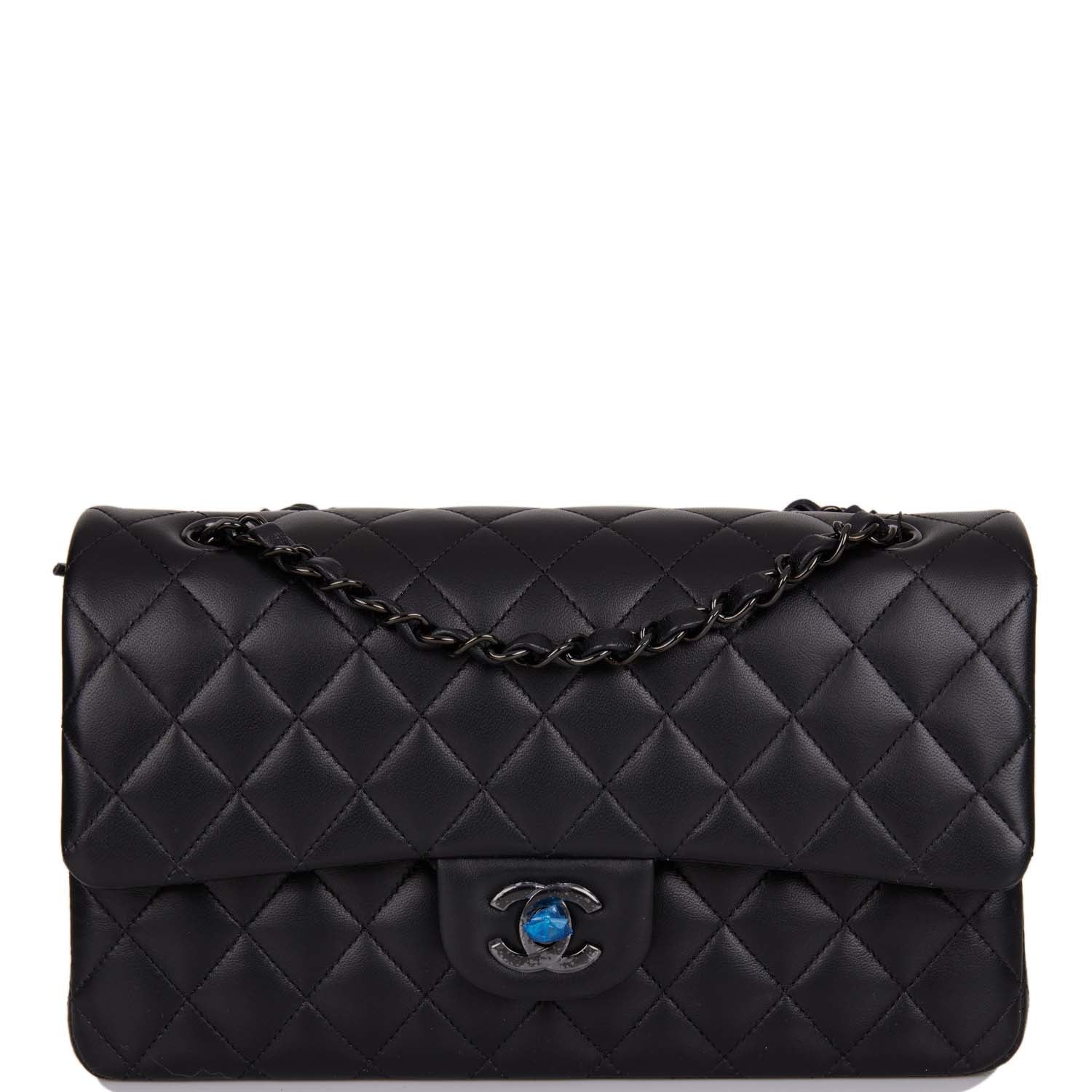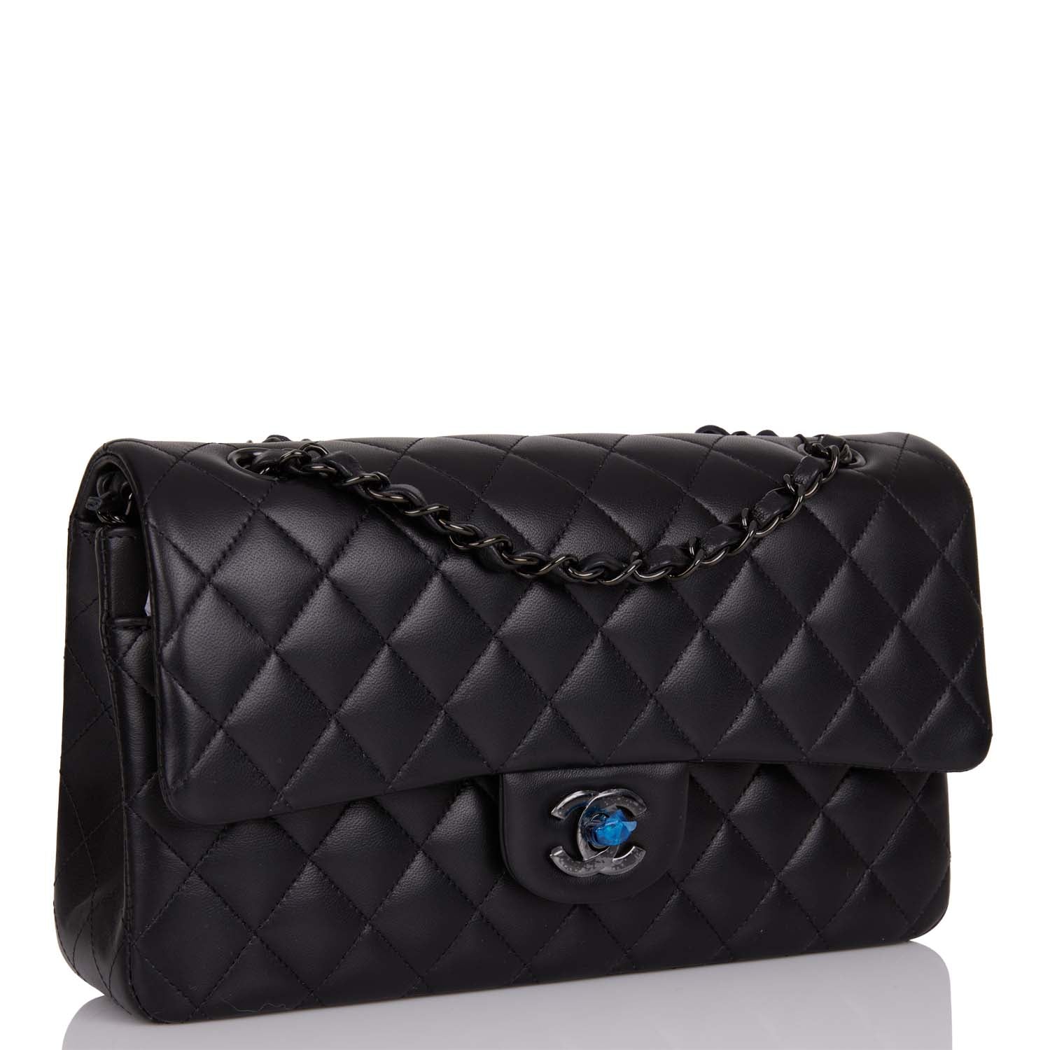 This Medium Classic Double Flap bag is in black lambskin leather with black hardware and features a front flap with signature CC turnlock closure, half moon back pocket, and adjustable interwoven black chain link and black leather shoulder strap.