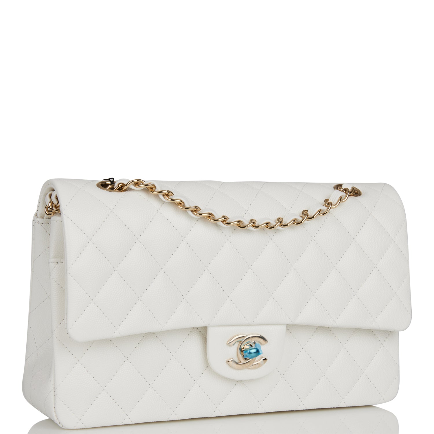 This Medium Classic Double Flap bag is in white caviar leather with light gold tone hardware and features a front flap with signature CC turnlock closure, half moon back pocket, and adjustable interwoven light gold tone chain link and white leather shoulder strap.