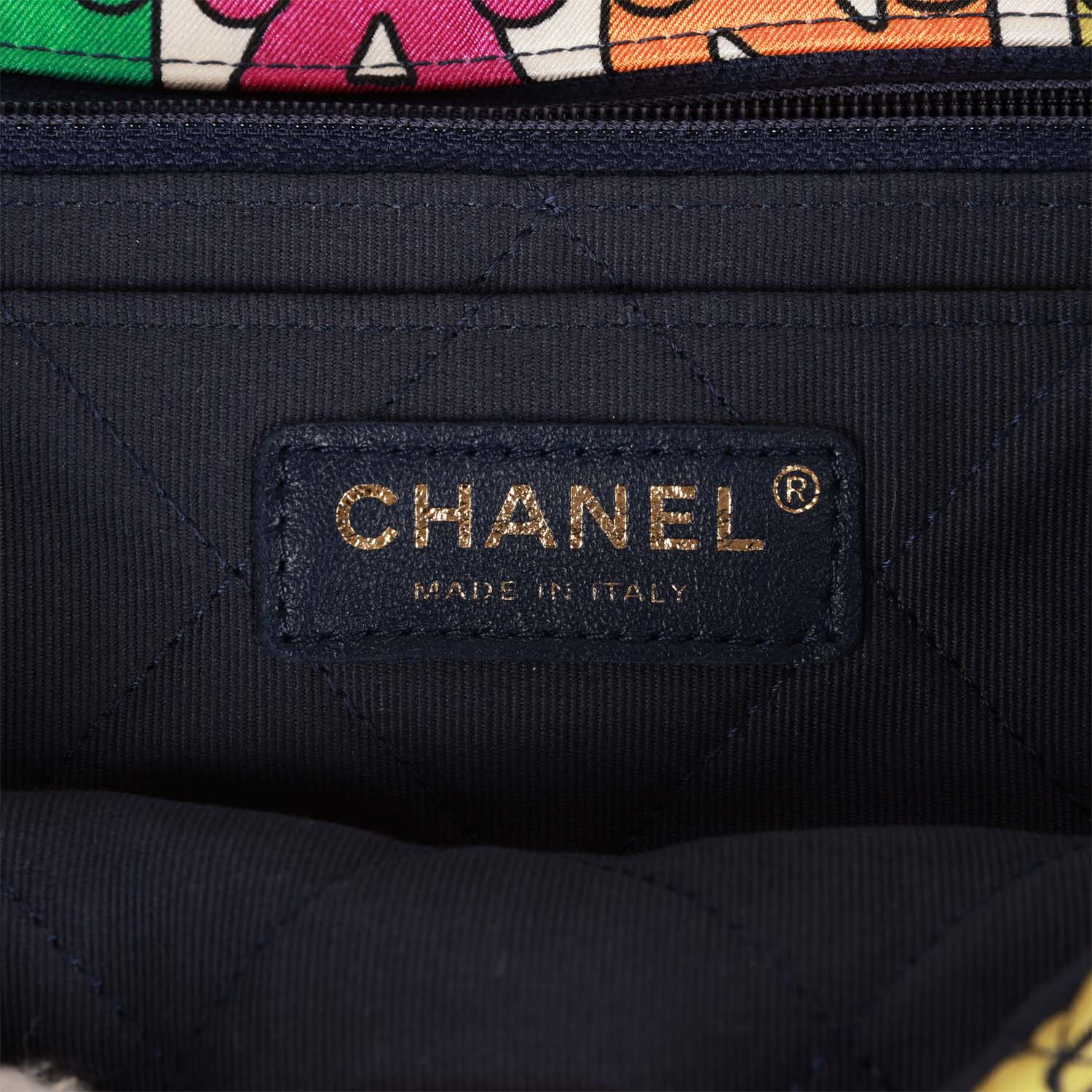 The interior is lined in quilted navy nylon fabric and has a zip pocket with logo pull and a slip pocket underneath on the back wall.
