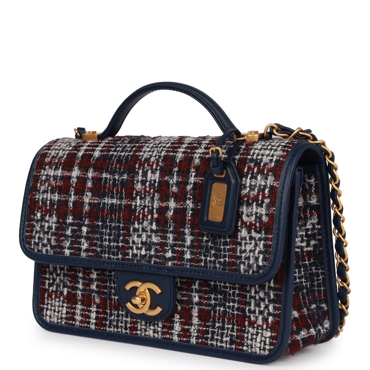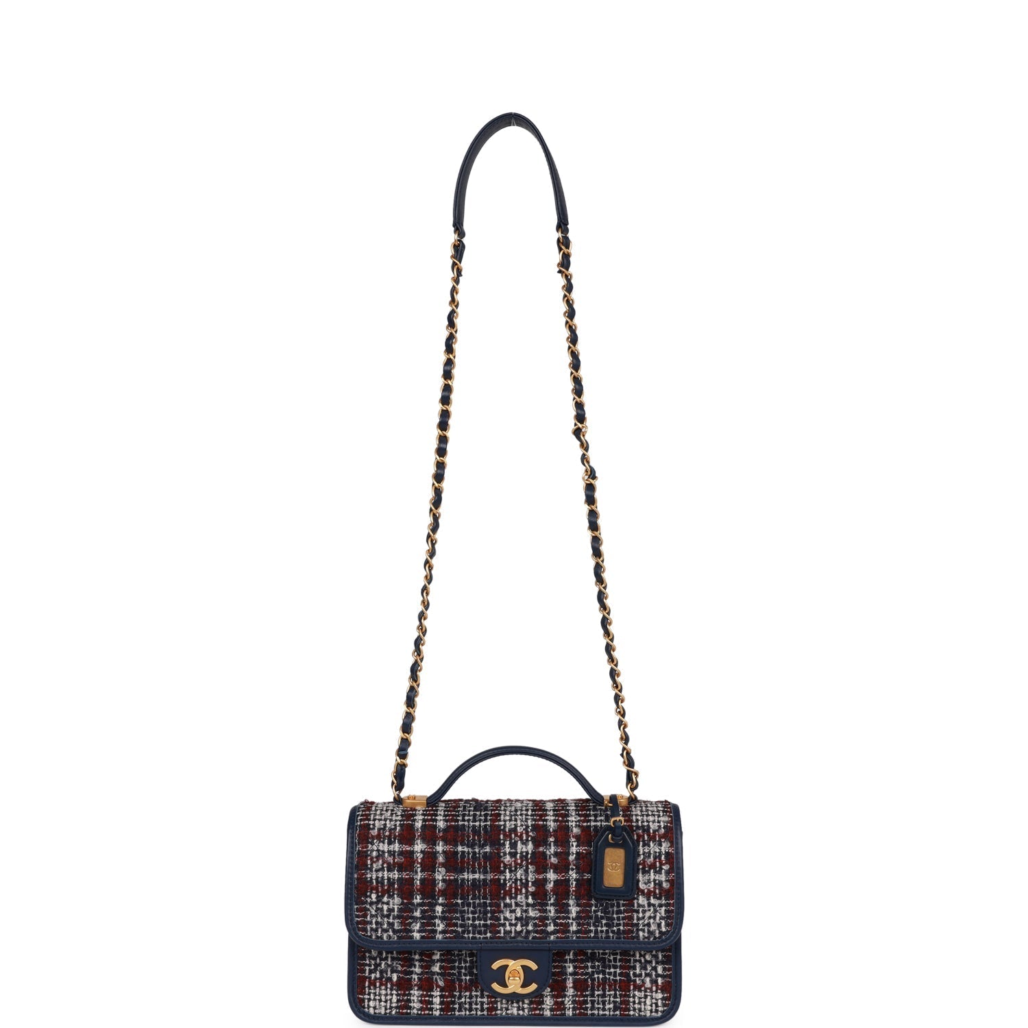 This Medium flap bag is in Navy and multicolor tweed with aged gold tone hardware and has a front flap with signature CC turnlock closure, top handle and single interwoven navy leather and aged gold tone chain link shoulder/crossbody strap.