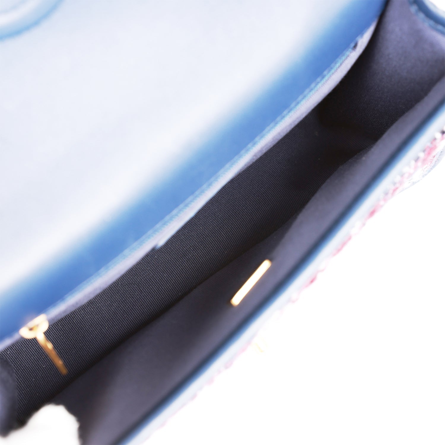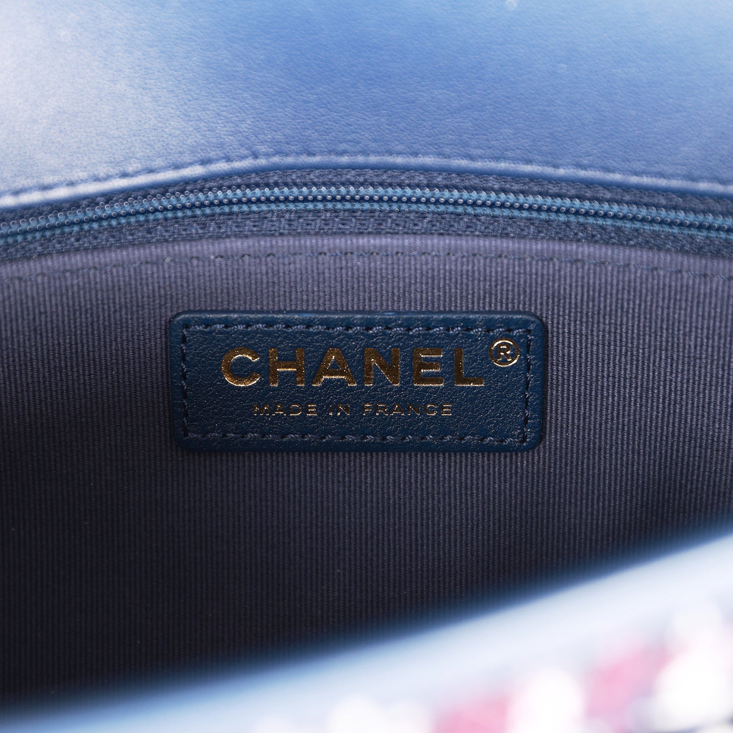 The interior is lined in navy fabric and features a zipper pocket with Chanel pull.