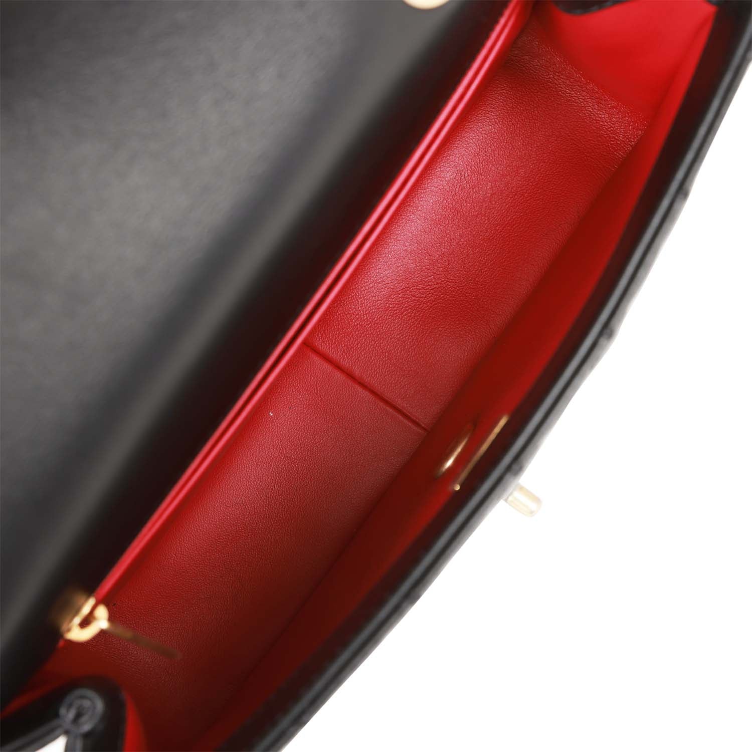 The interior is lined in red leather one zip pocket and one open pocket on the rear wall.