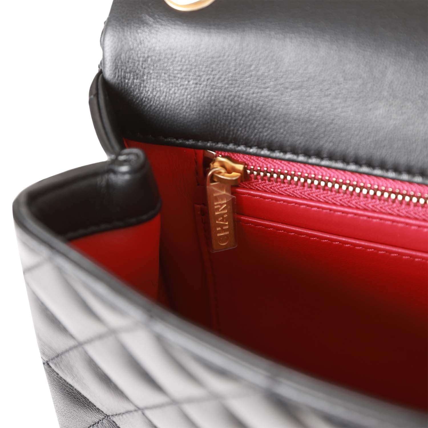 This Medium Camellia Crush Flap Bag is in Black lambskin leather with antique gold tone hardware and has a front flap with CC turnlock closure, back pocket and adjustable antique gold tone chain link shoulder/crossbody strap with camelia flower attachment.