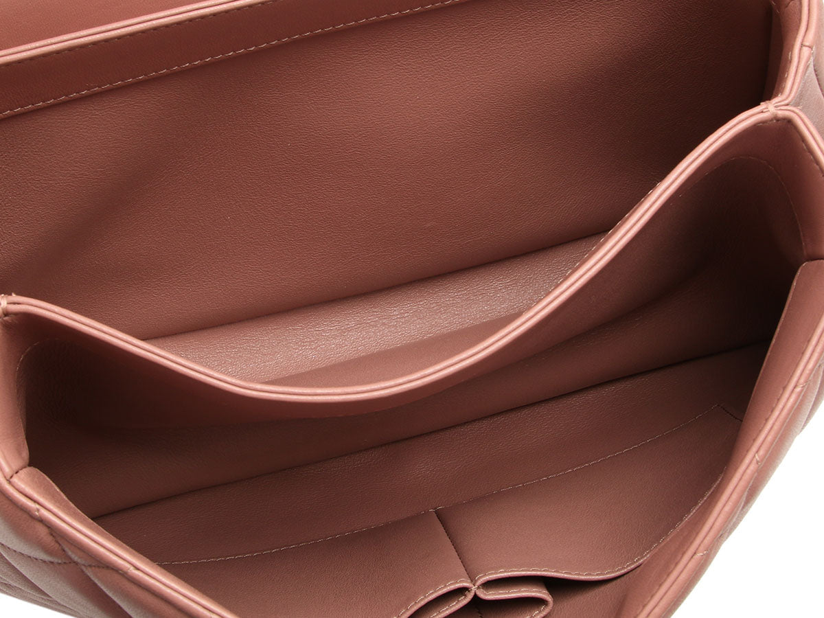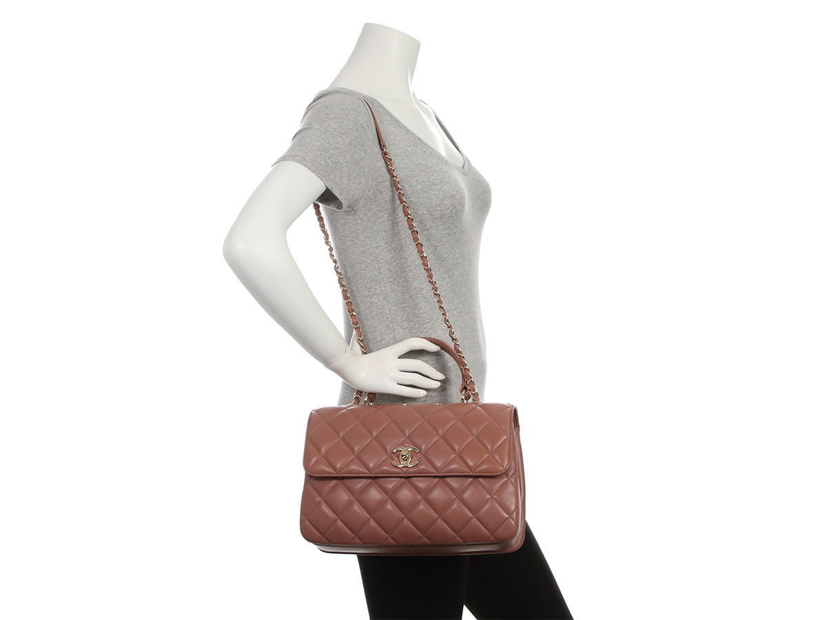 A modern take on the Classic Flap, this Chanel Medium Mauve Quilted Lambskin Trendy CC Flap delivers refined structure and two carrying options! Crafted from diamond-quilted lamb leather in a muted pinkish tone, it features a gold logo plate on top along with a handle with a 3.5-inch drop and leather-through-chain strap with a 19-inch drop for crossbody styling. The flap secures with a CC turnlock and opens to a tonal leather-lined interior divided into three sections with two slide pockets in the front compartment and one zipped pocket in the back. In very good condition from 2018, it has light wear on the corners, wear on the hardware, and marks on the leather and inside of the flap. Since its debut at the spring 2014 runway show, the Trendy CC has become one of Chanel’s most popular bags!