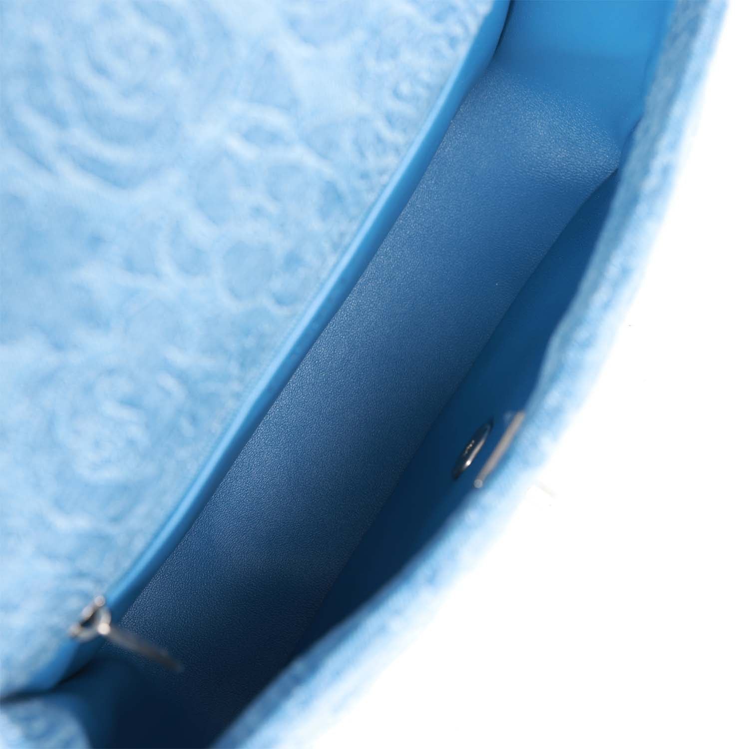 This Medium Sweetheart Crush Flap bag is in Blue denim brocade with aged silver hardware, front flap with CC turnlock closure, half moon back pocket, and aged silver tone chain link shoulder/crossbody strap.