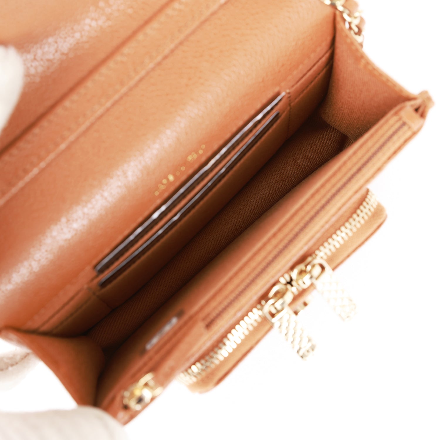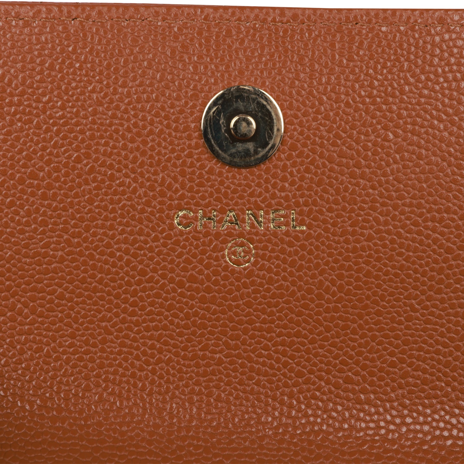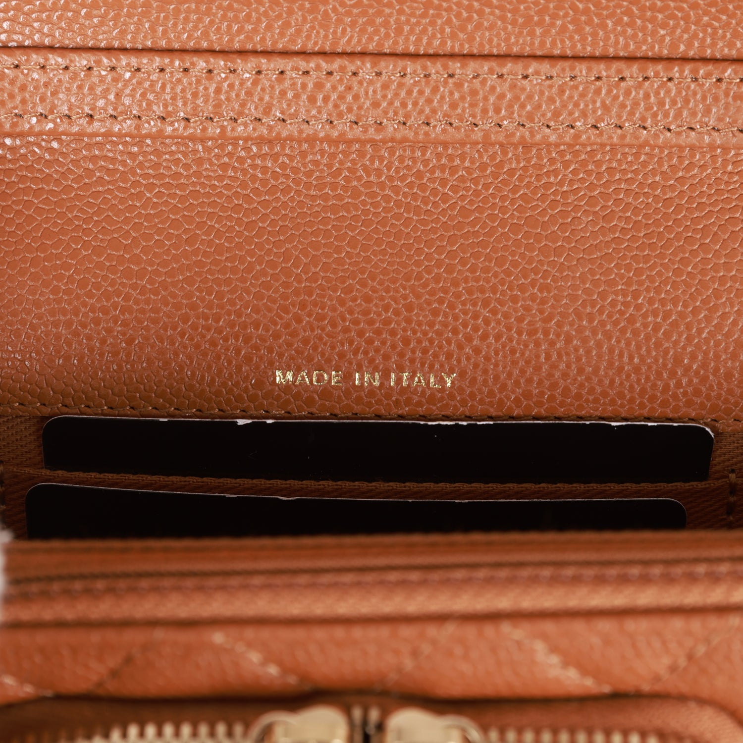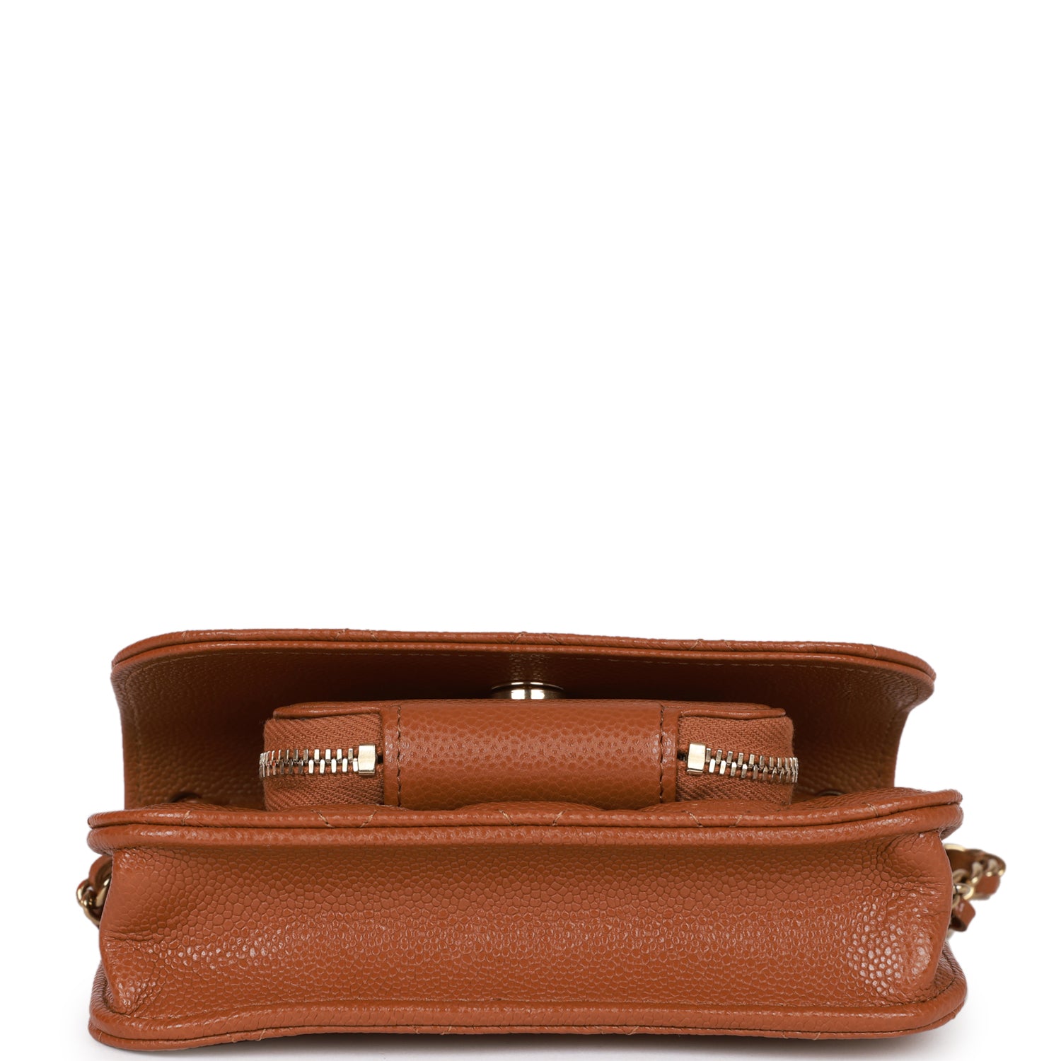 This Micro Business Affinity bag is of caramel caviar leather with light gold tone hardware and has a front flap with signature CC logo, back zip pocket and long adjustable light gold tone and caramel leather chain.