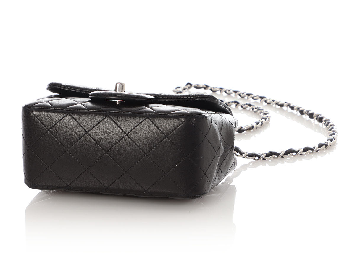 Rock this Chanel Mini Classic as a crossbody or clutch—you’re in the driver’s seat! It's made of black diamond-quilted lambskin with silver hardware, and the leather-through-chain strap has a 20.5-inch drop that can be slipped inside for a hand carry. The flap secures with a CC logo turnlock that opens to black leather lining with one zipped pocket and one slide pocket inside. In good condition from 2012-13, it comes with a dustbag, box, and has wear on the corners, edges, and inside, marks on the leather, scuffing on the edges of the back pocket, and the sides bulge out a bit. This mini beauty has a slide pocket on the back perfect for a tiny origami swan, subway token, or concert ticket!