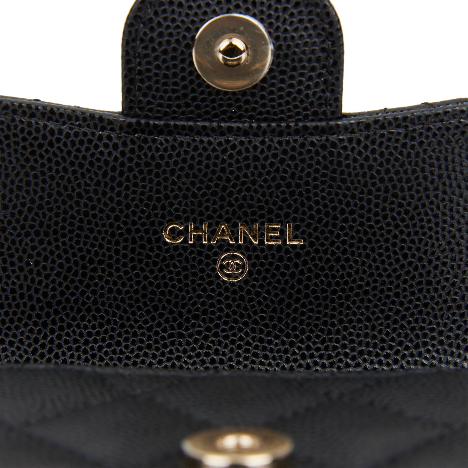 This Mini Clutch with Chain bag is of black caviar leather with gold tone hardware and has a front flap with signature CC, magnetic closure, single interwoven black leather and gold tone chain link shoulder/crossbody strap.