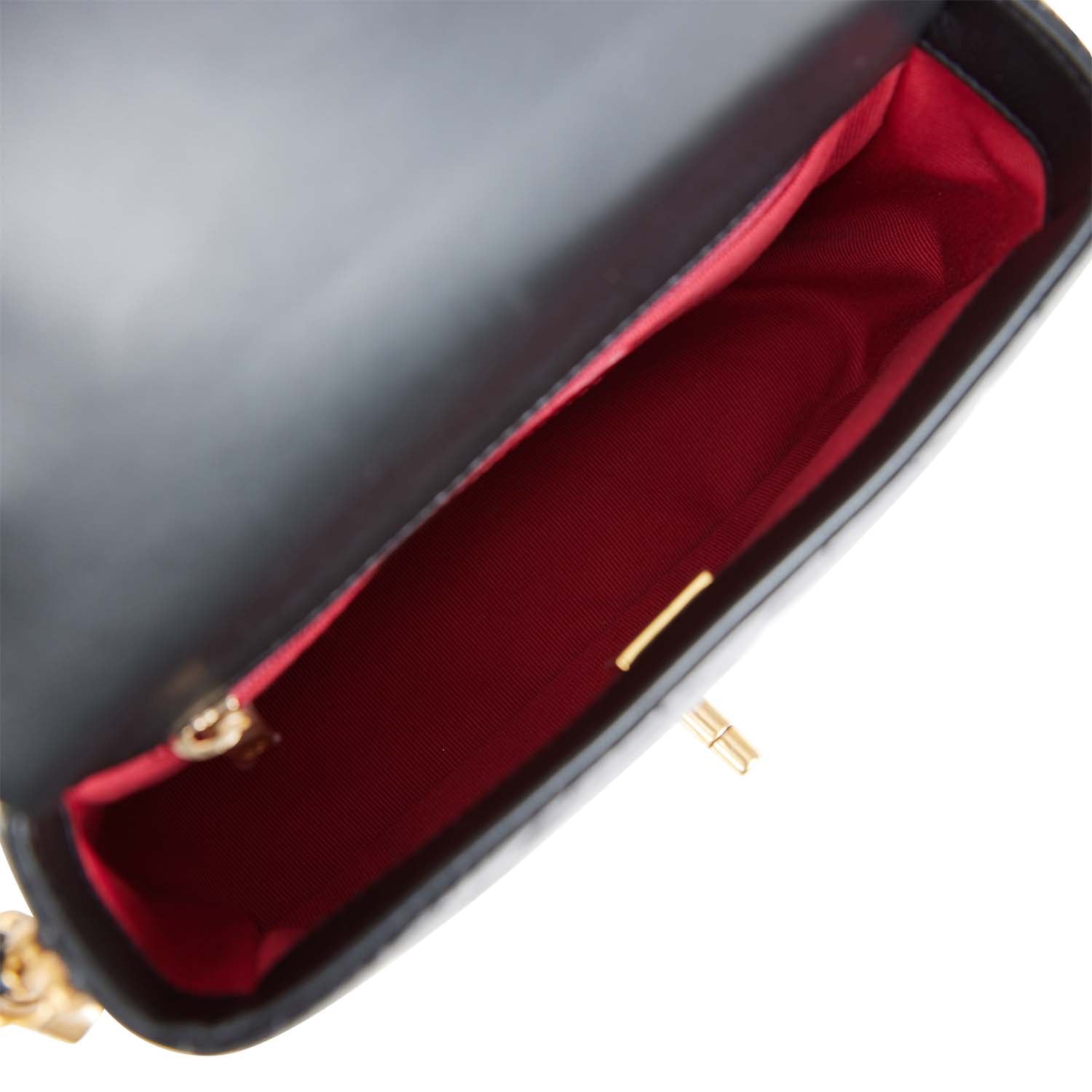 This Mini My Perfect flap bag is of black lambskin with antique gold tone hardware and has a front flap with signature CC turnlock closure, single interwoven black leather and antique gold tone chain link shoulder/crossbody strap with adjustable push button as well as a peal strap.