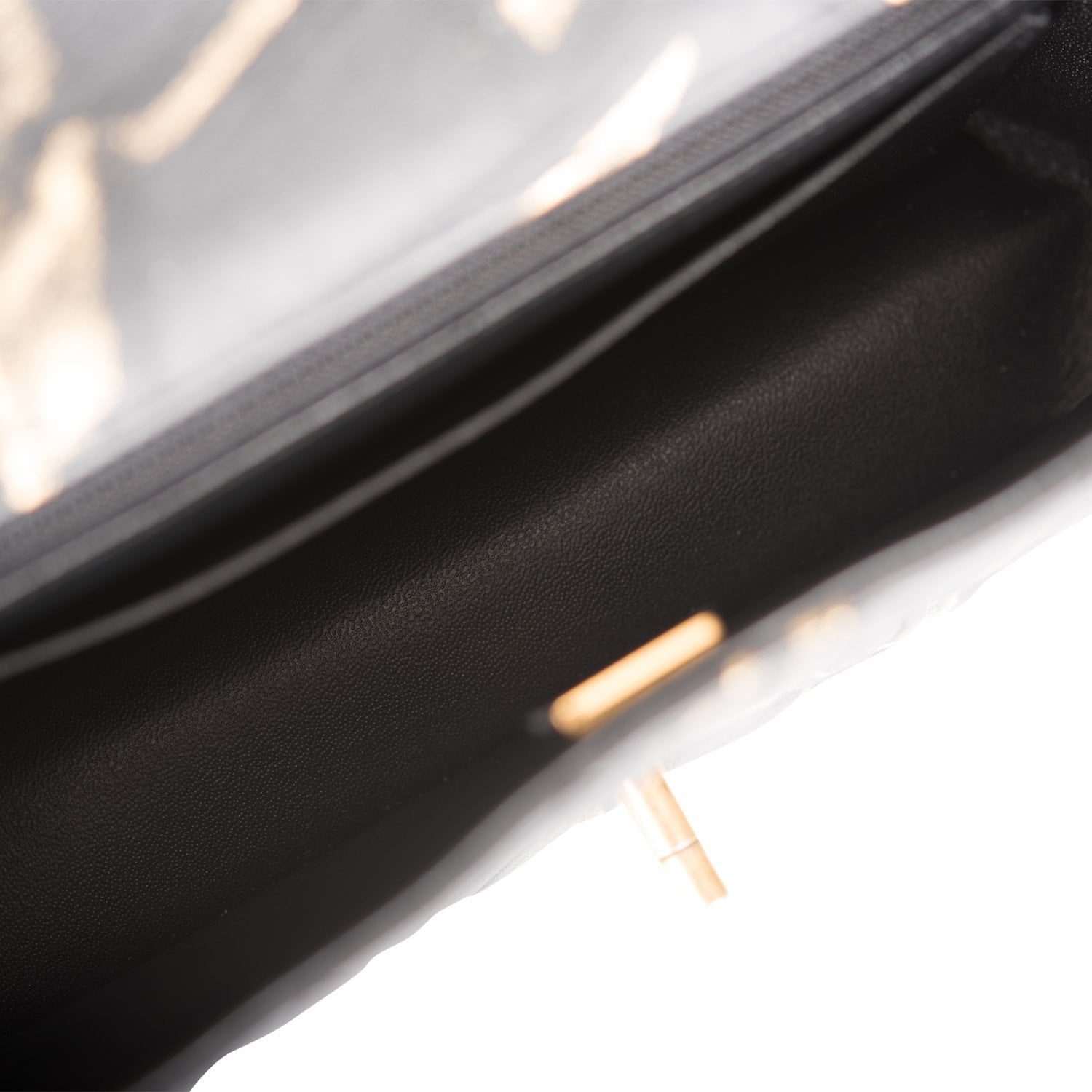 This Mini Rectangular flap bag is in black and gold aged calfskin with antique gold tone hardware and has a front flap with signature CC turnlock closure, rear half moon pocket and single interwoven black leather and antique gold tone chain link shoulder/crossbody strap.