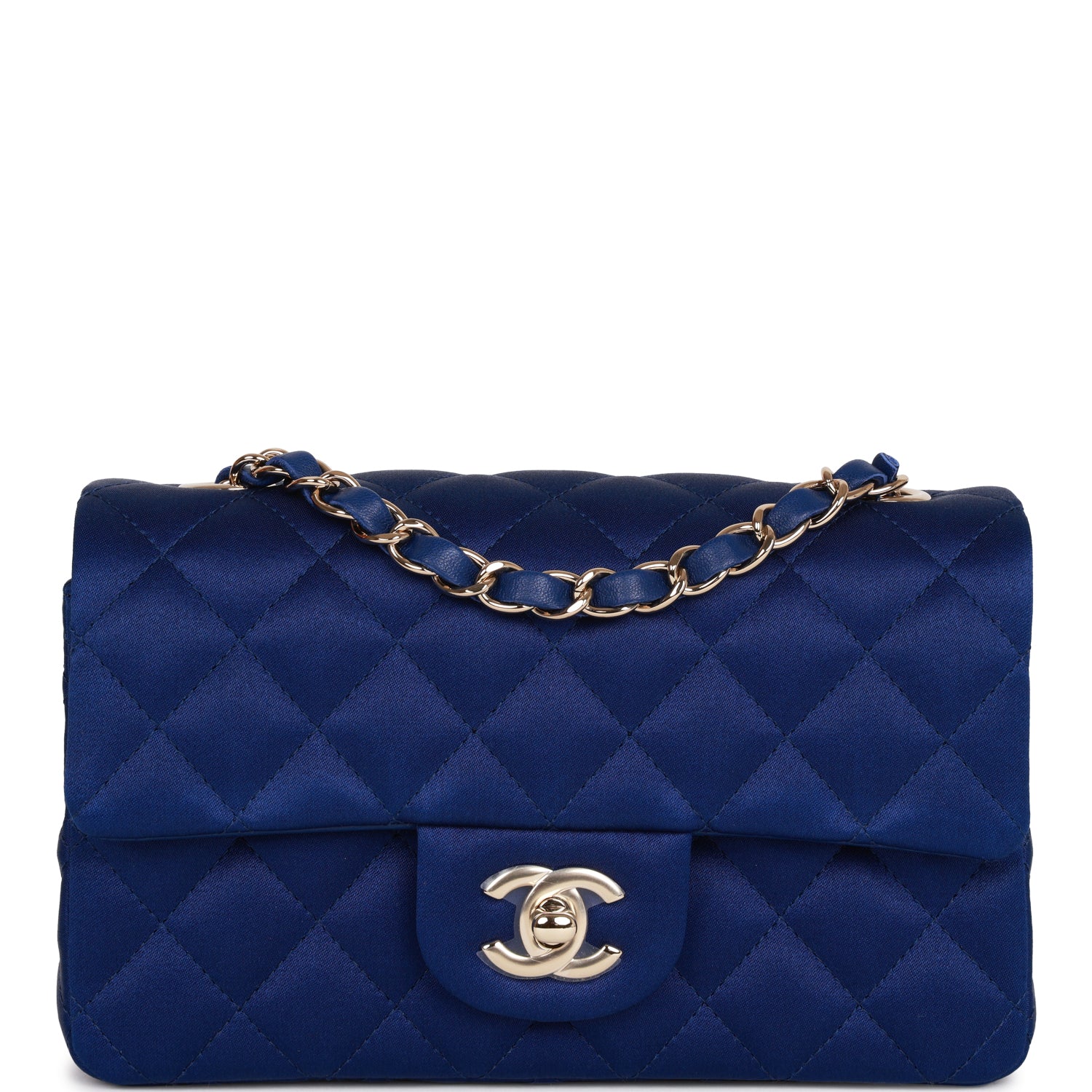 This Mini Rectangular flap bag is of blue satin leather with light gold tone hardware and has a front flap with signature CC turnlock closure, rear half moon pocket, single interwoven blue leather and light gold tone chain link shoulder/crossbody strap.