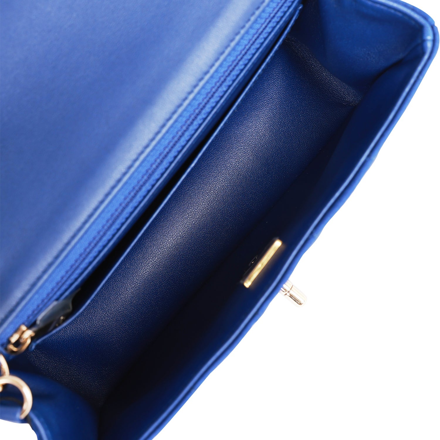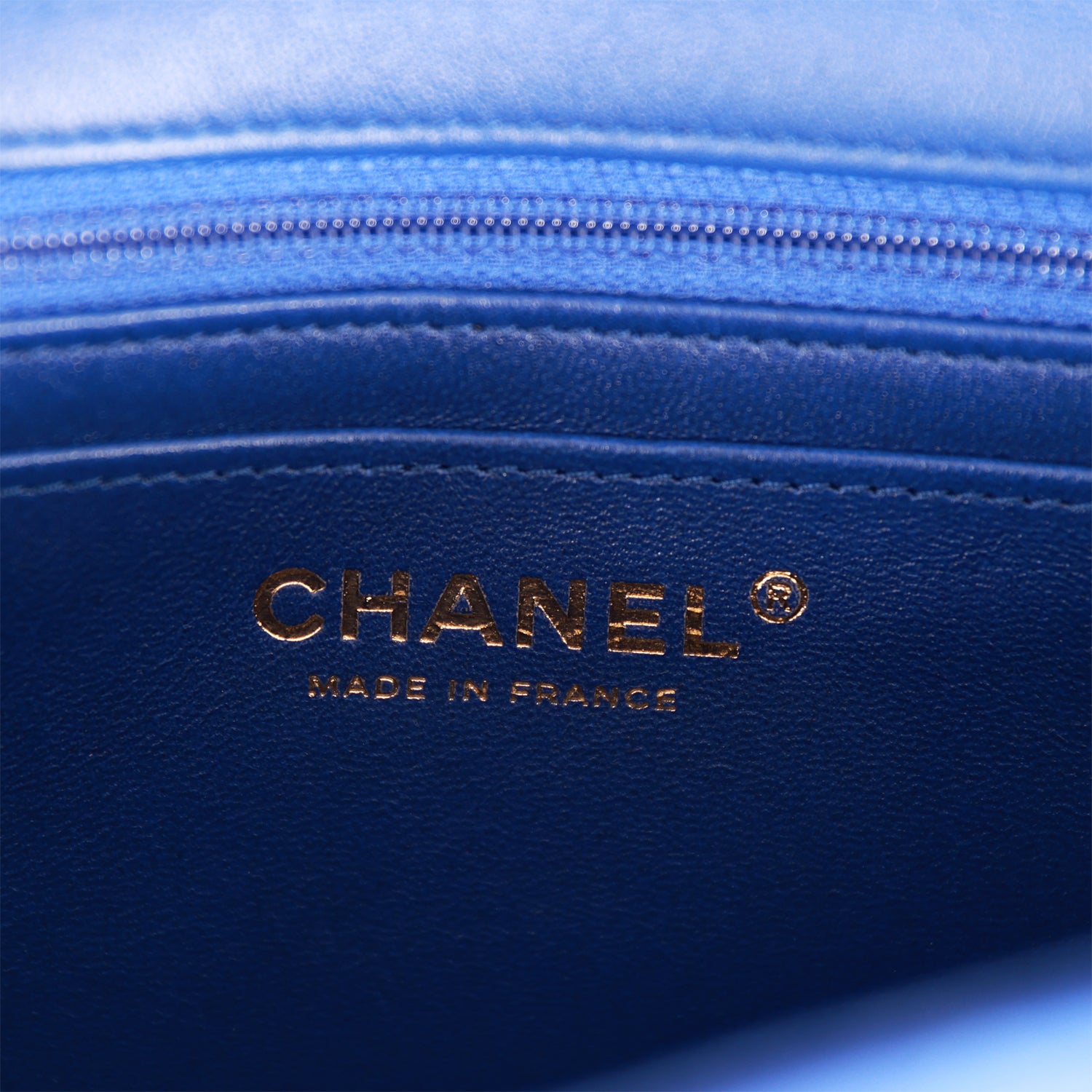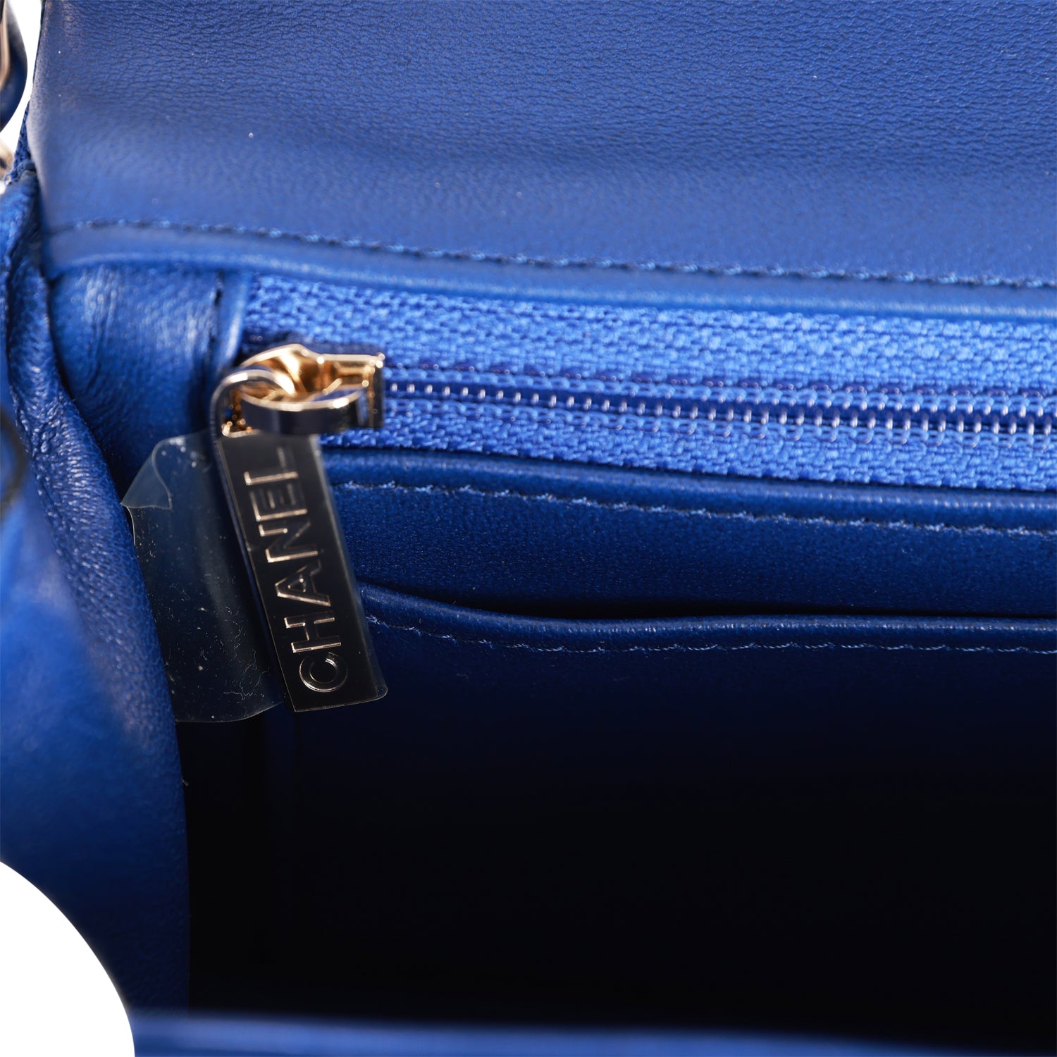 The interior is lined in blue leather and features a zipper pocket with Chanel pull and an open pocket below.