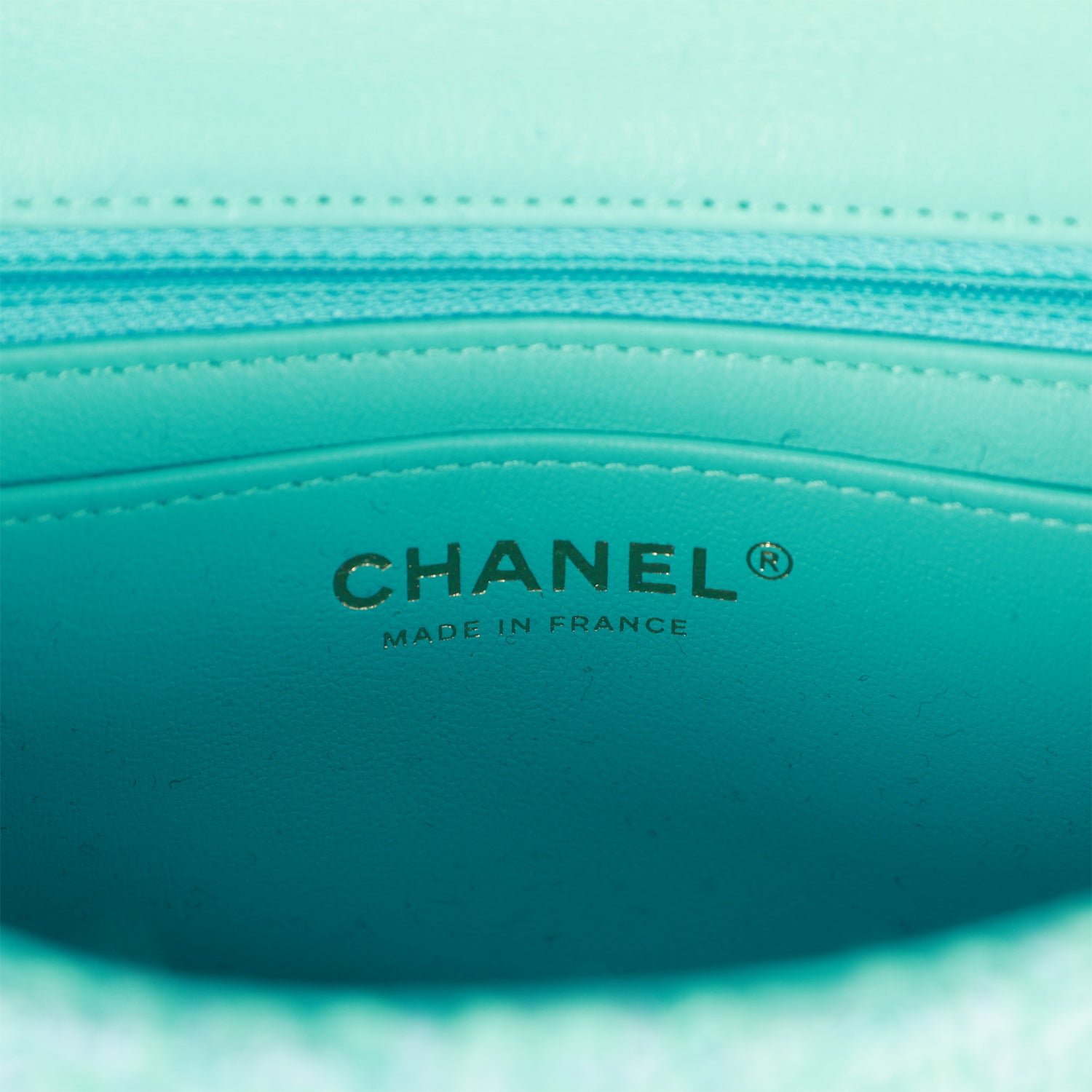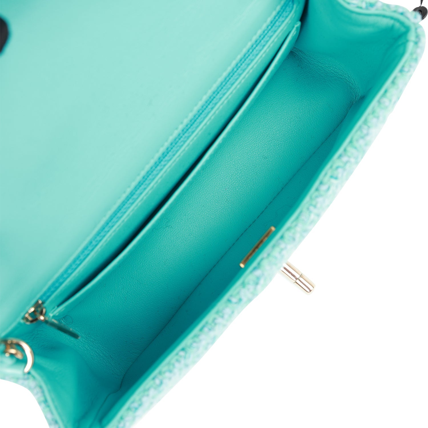 This Mini Rectangular flap bag is of blue tweed with light gold tone hardware and has a front flap with signature CC turnlock closure, rear half moon pocket, single interwoven light blue leather and light gold tone chain link shoulder/crossbody strap.