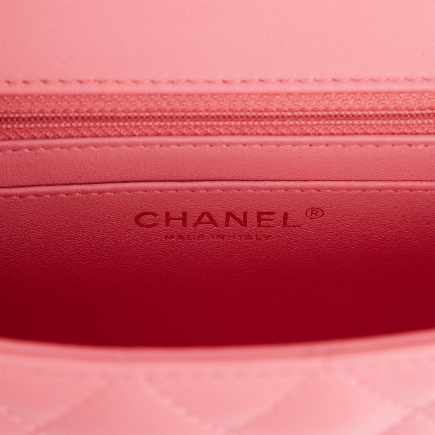 The interior is lined in coral leather and features a zipper pocket with Chanel pull and an open pocket below.