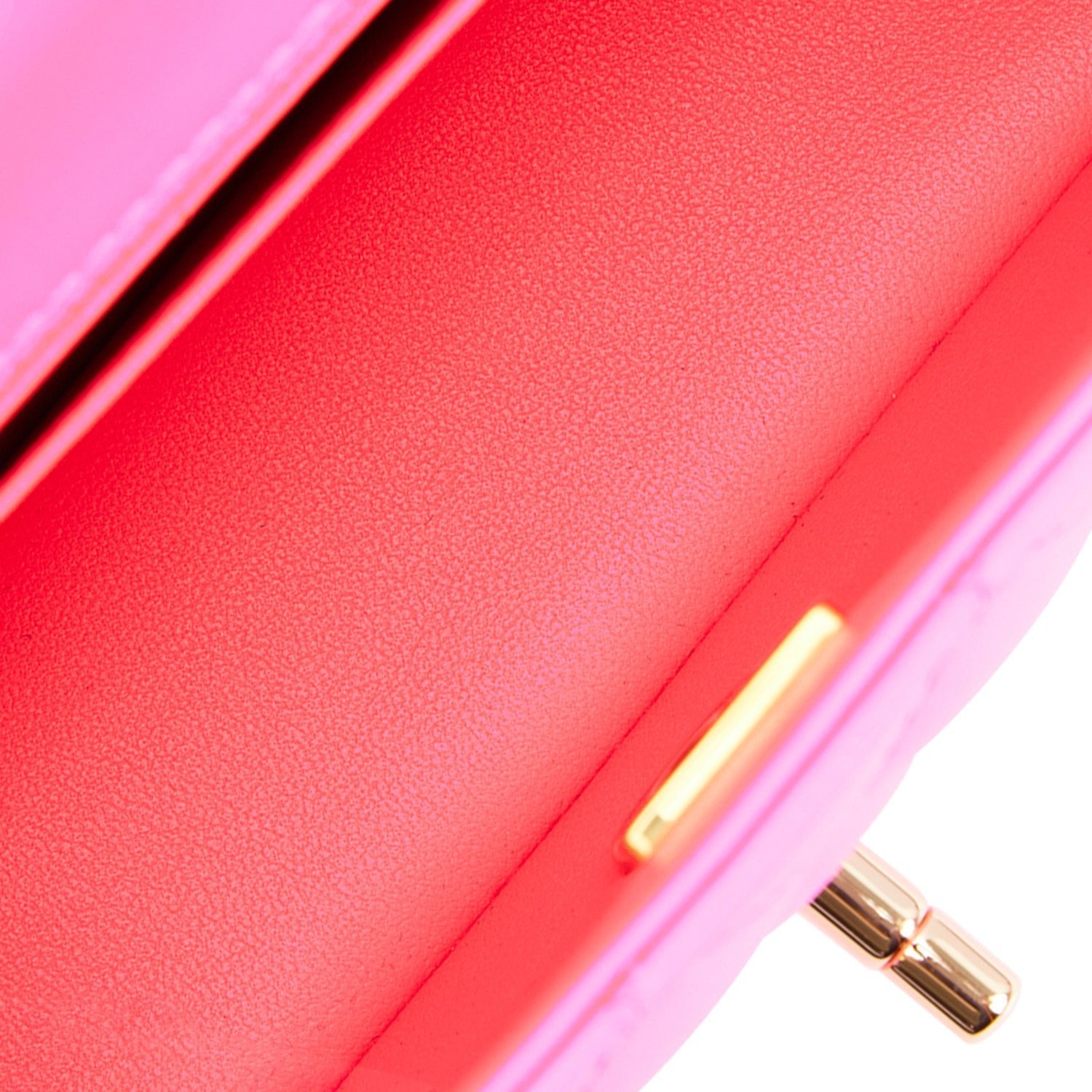 This Mini Rectangular flap bag is of pink lambskin leather with light gold tone hardware and has a front flap with signature CC turnlock closure, rear half moon pocket, single interwoven pink leather and light gold tone chain link shoulder/crossbody strap.