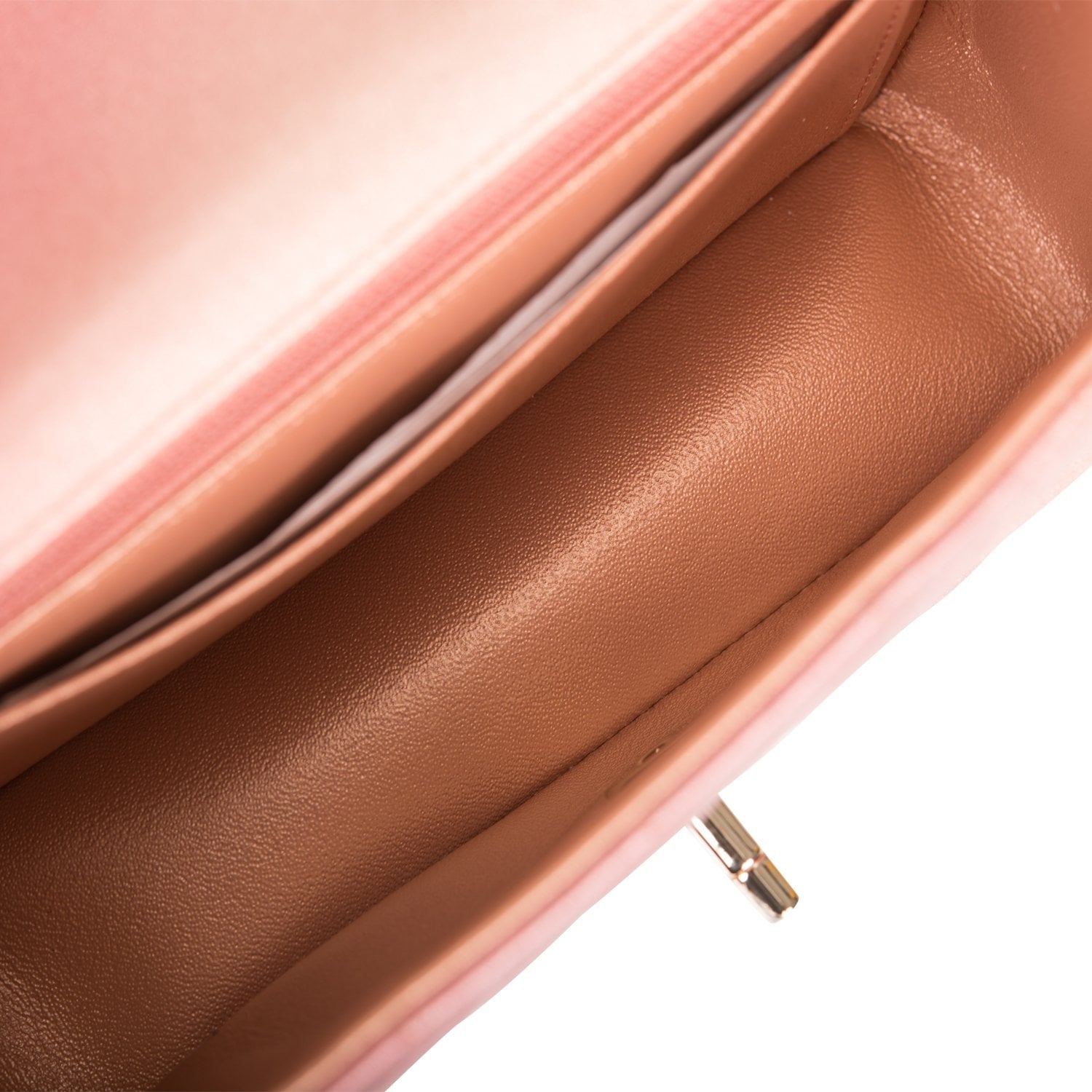This Mini Rectangular flap bag is in ombre pink metallic lambskin with light gold tone hardware and has a front flap with signature CC turnlock closure, rear half moon pocket and single interwoven ombre pink leather and light gold tone chain link shoulder/crossbody strap.
