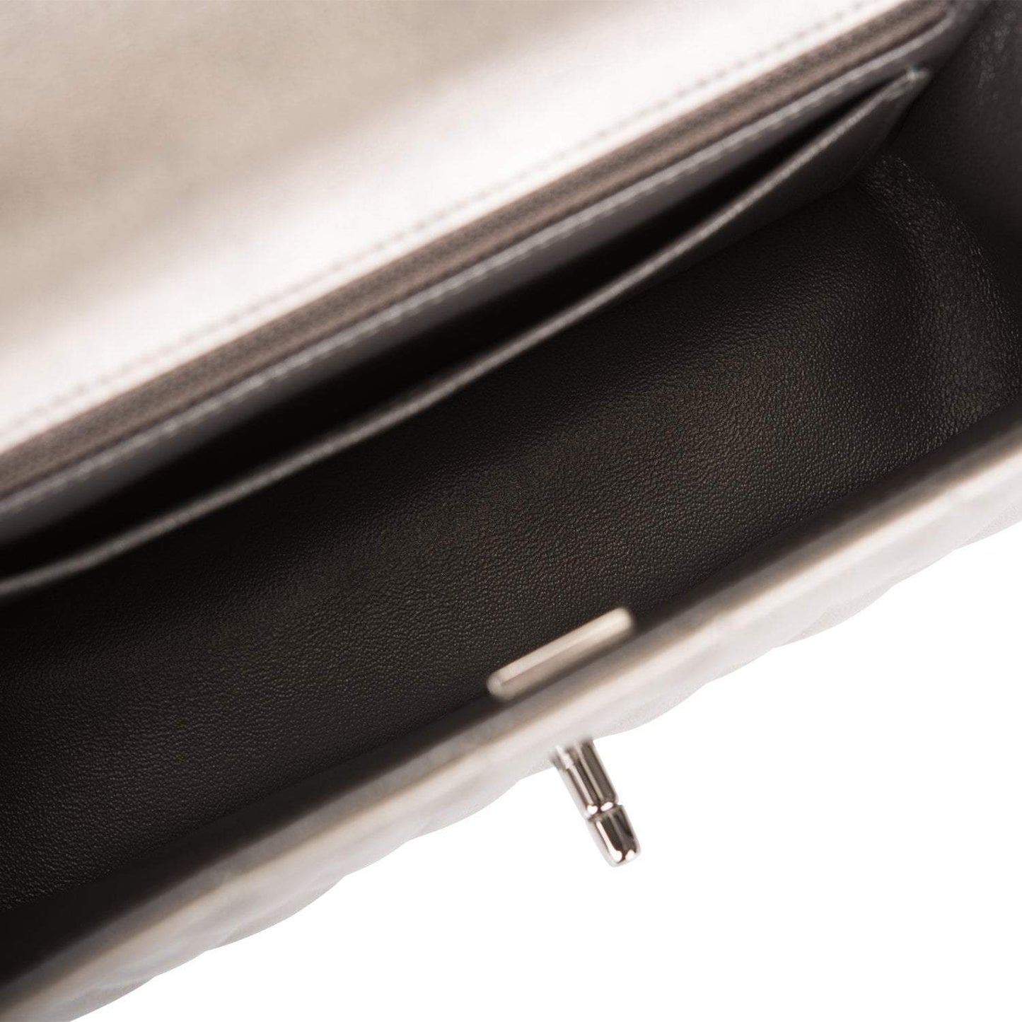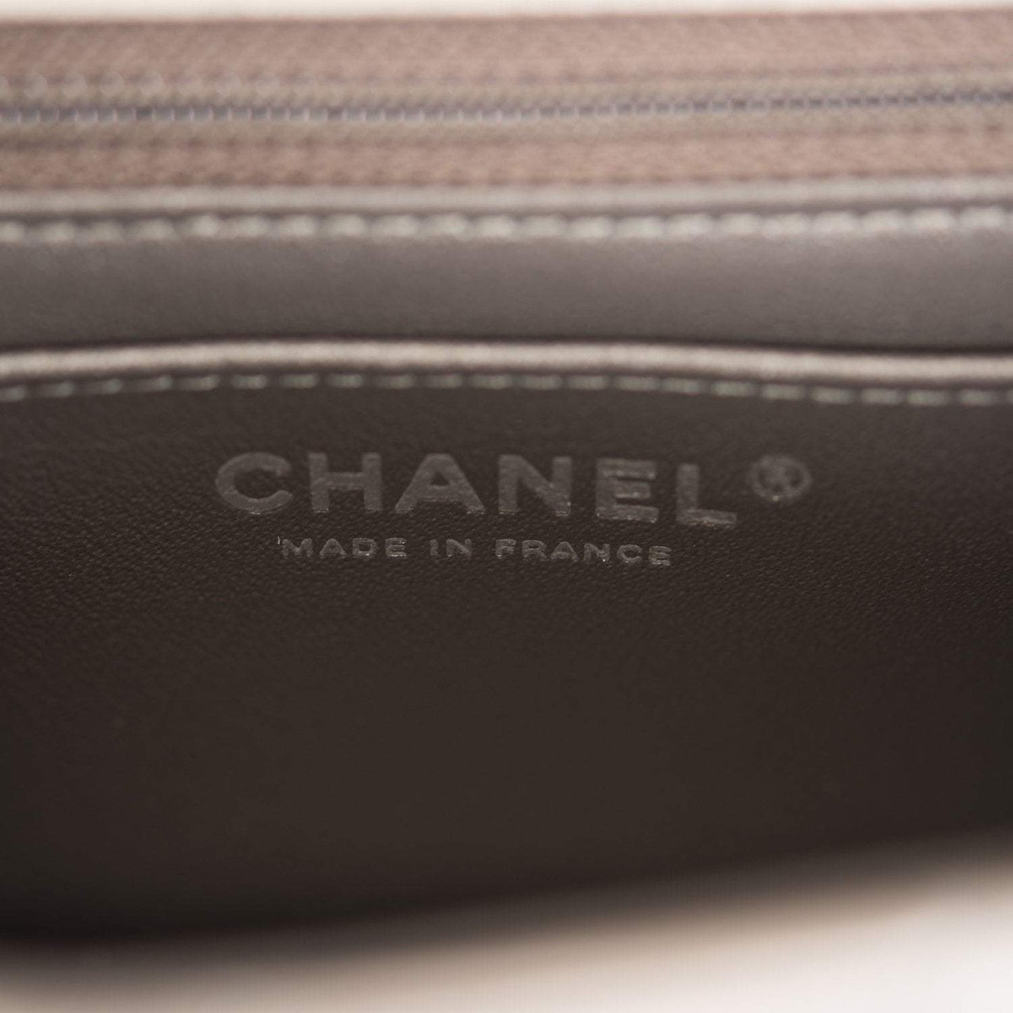 The interior is lined in ruthenium leather and features a zipper pocket with Chanel pull and an open pocket below.