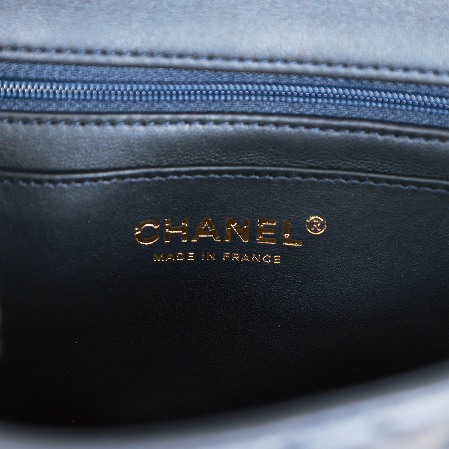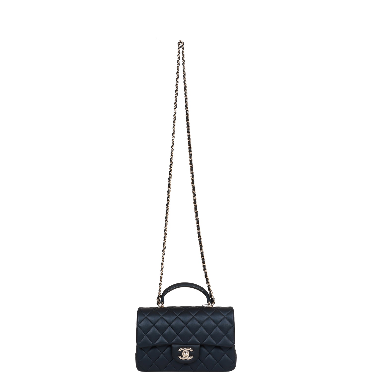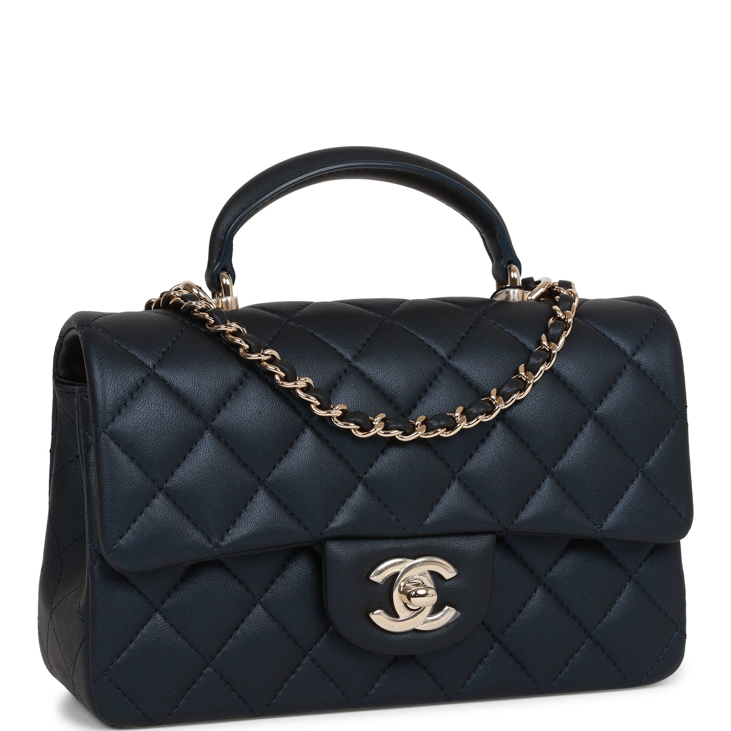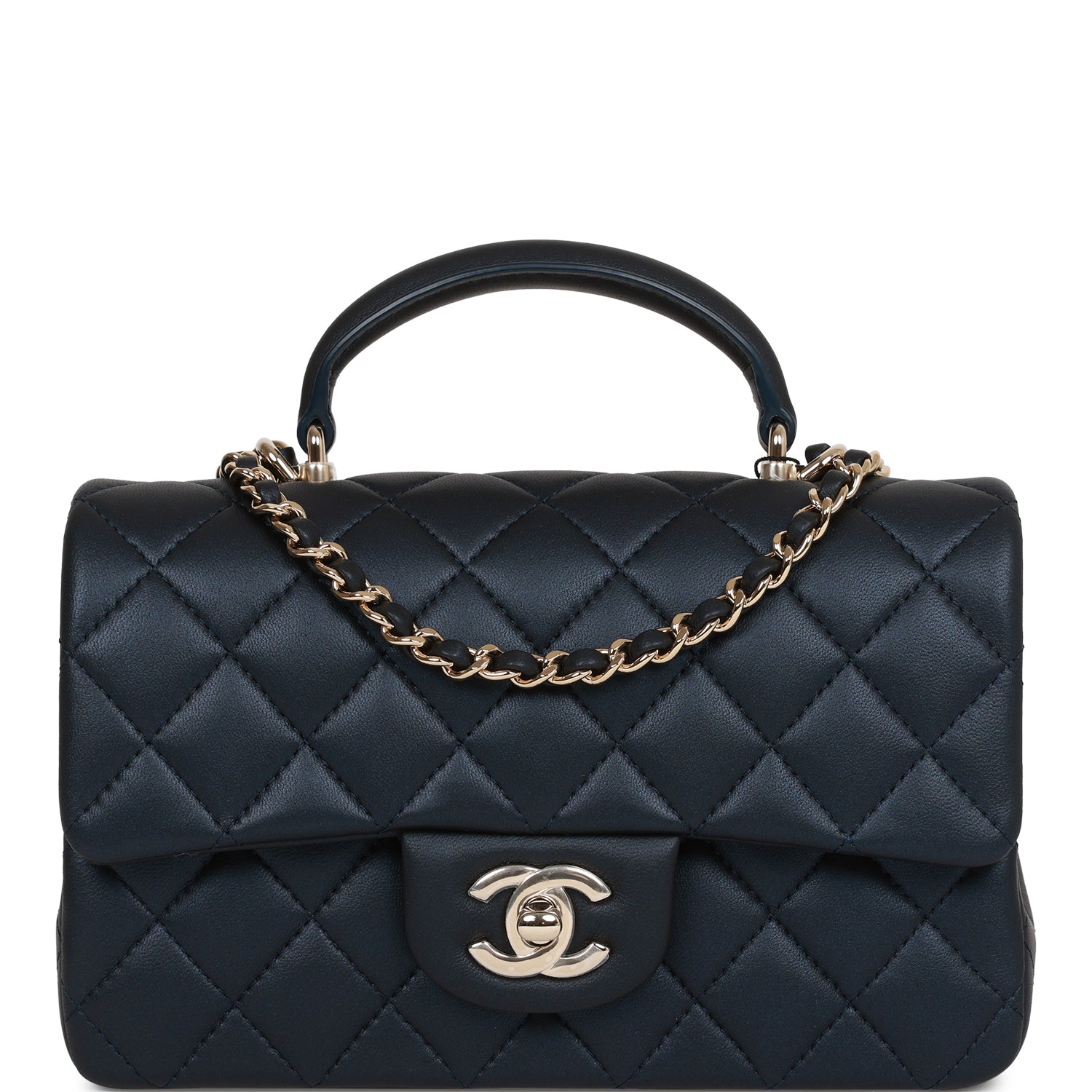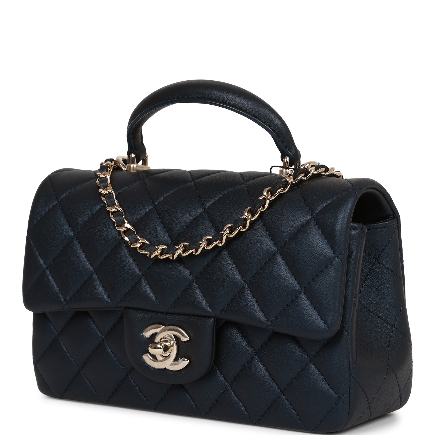 Chanel Mini Rectangular Flap Bag with Top Handle Dark Blue Lambskin Light Gold Hardware