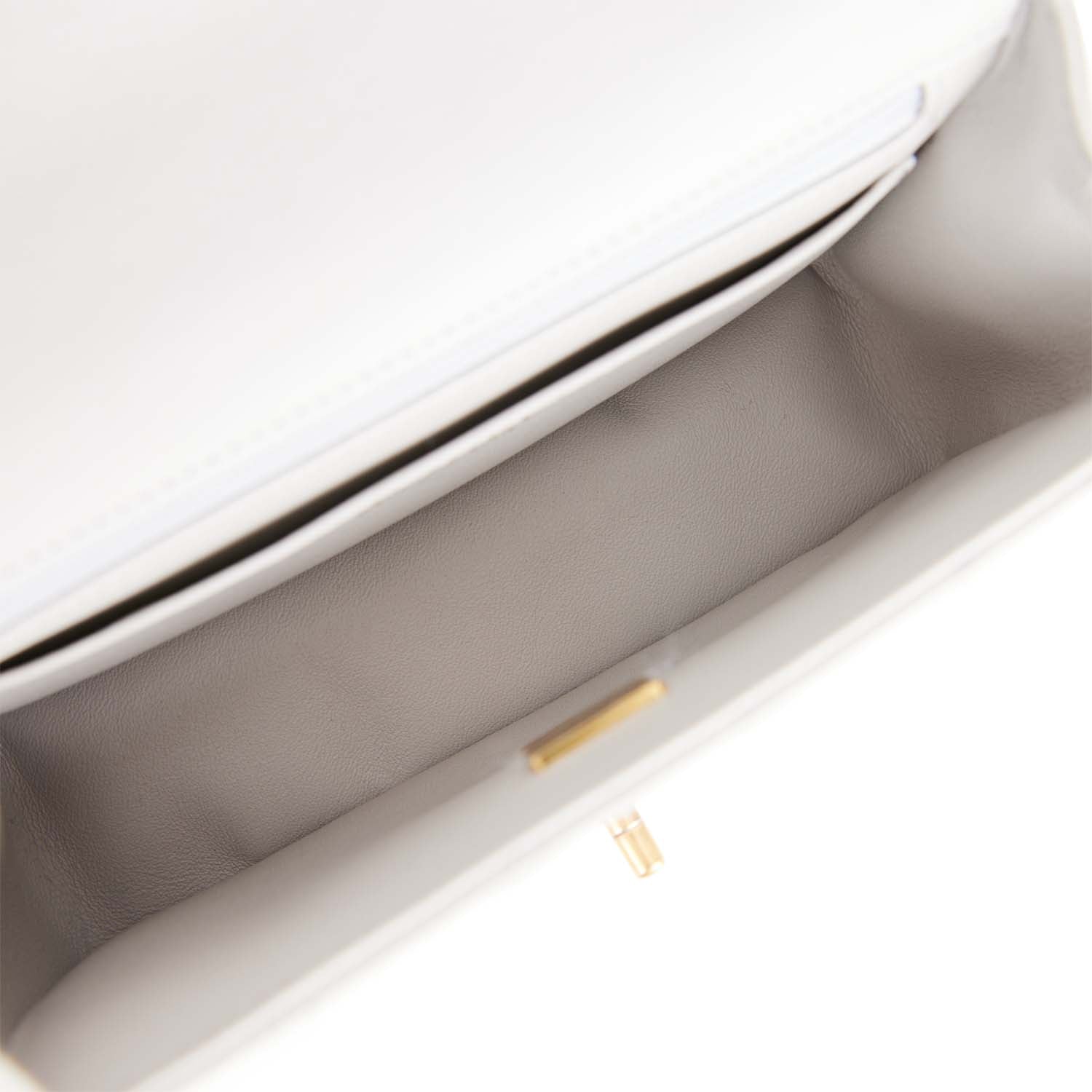 This Mini Rectangular flap bag is in grey lambskin with antique gold tone hardware and has a front flap with signature CC turnlock closure, rear half moon pocket, top handle and single interwoven grey leather and antique gold tone chain link shoulder/crossbody strap.