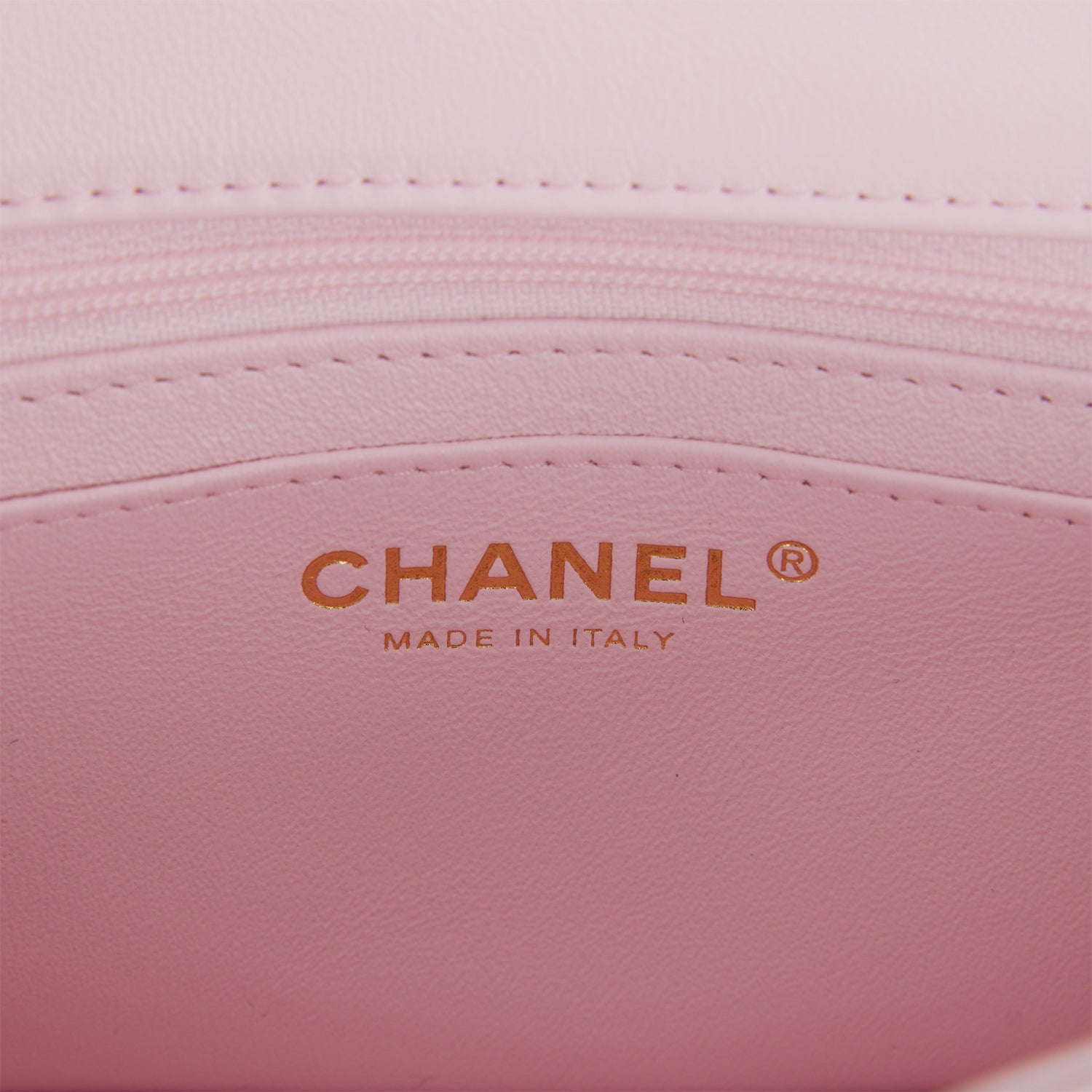 The interior is lined in light pink leather and features a zipper pocket with Chanel pull and an open pocket below.