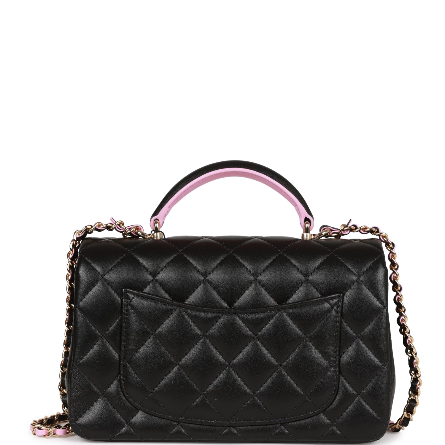This Mini Rectangular flap bag is in Black lambskin with light gold tone hardware and has a front flap with signature CC turnlock closure, rear half moon pocket, black and light pink top handle and single interwoven light pink leather and light gold tone chain link shoulder/crossbody strap.