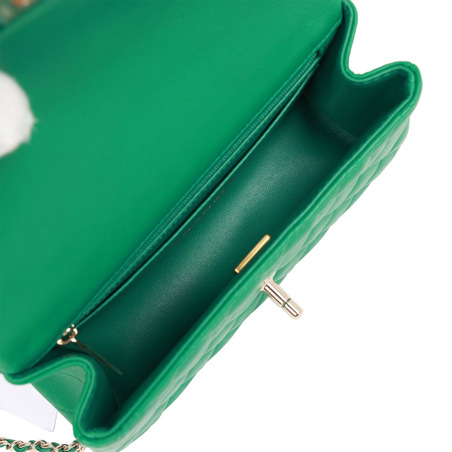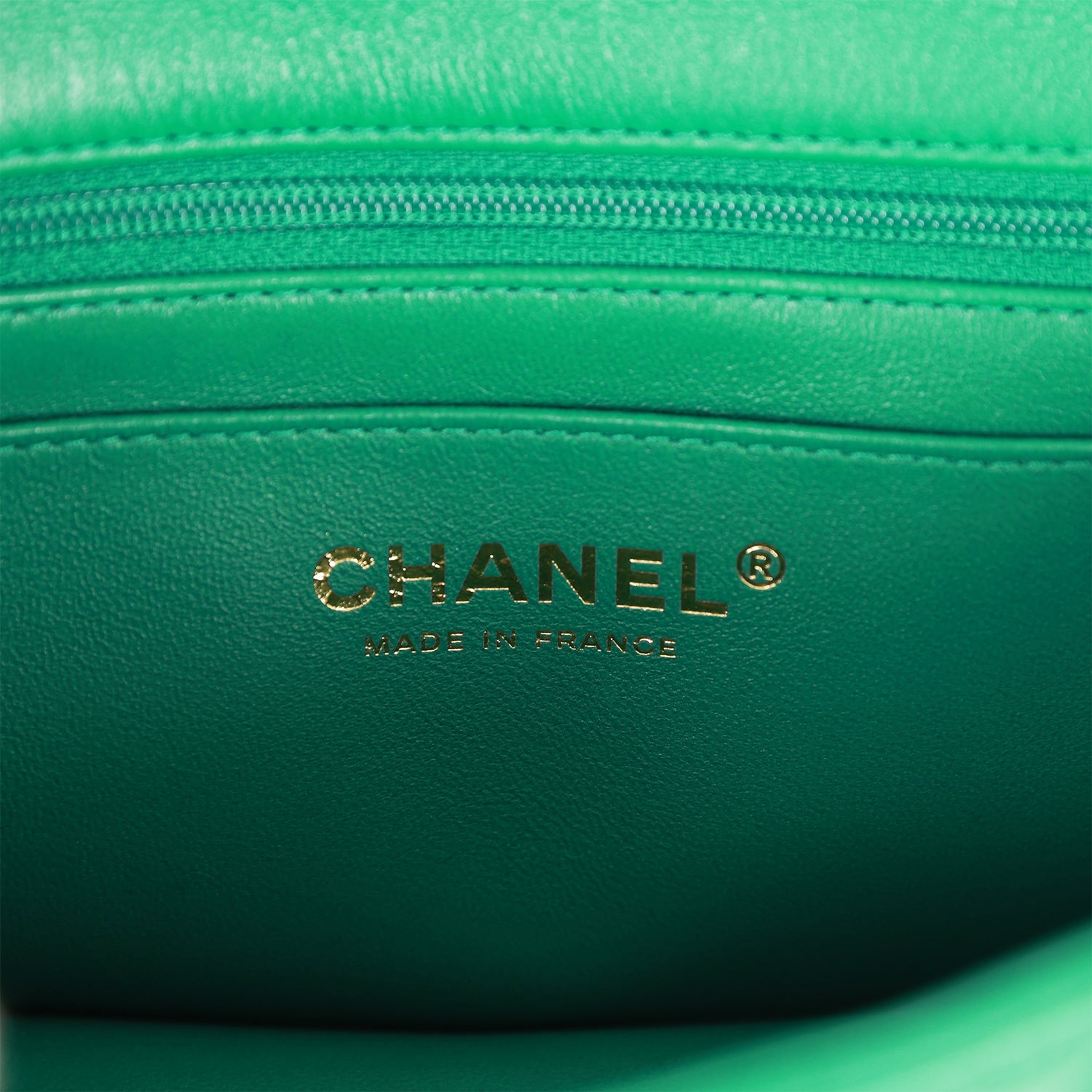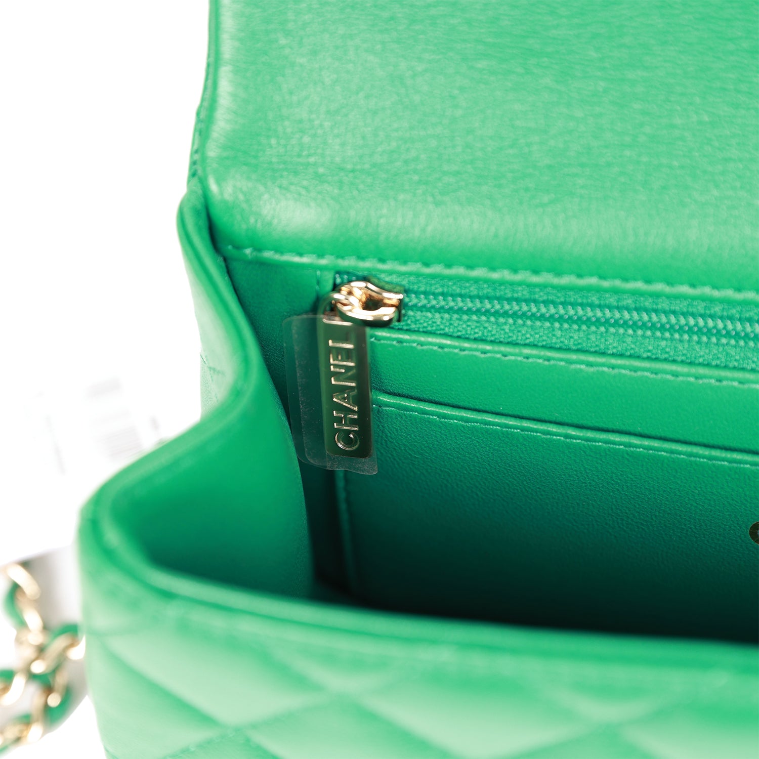 The interior is lined in green leather and features a zipper pocket with Chanel pull and an open pocket below.