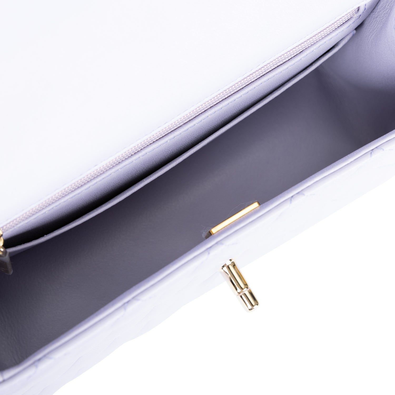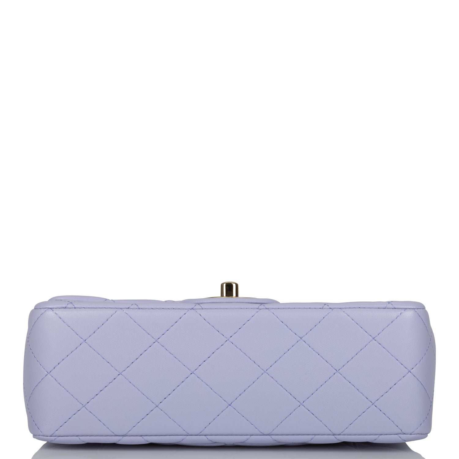 This Mini Rectangular flap bag is in lavender lambskin with light gold tone hardware and has a front flap with signature CC turnlock closure, rear half moon pocket, top handle and single interwoven lavender leather and light gold tone chain link shoulder/crossbody strap.