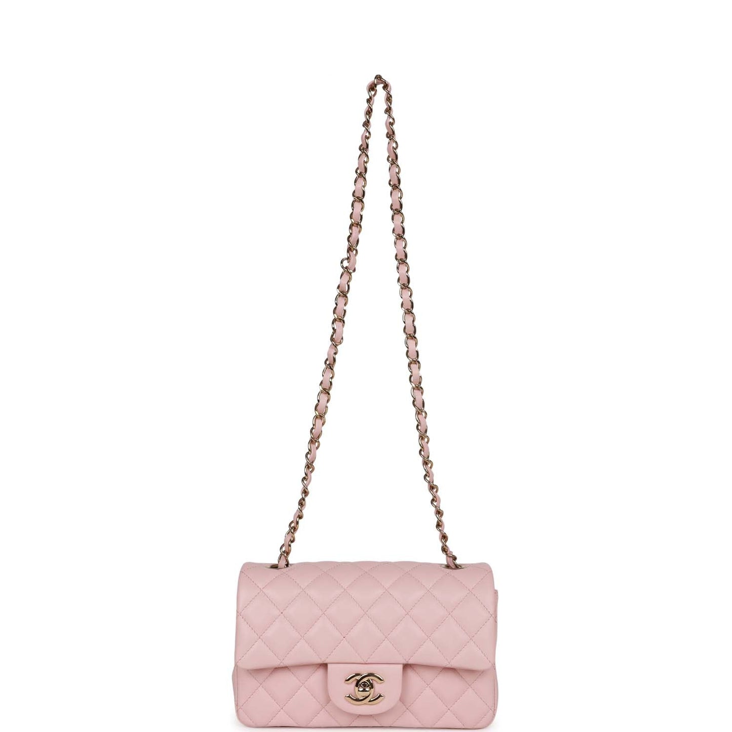 This Mini Rectangular flap bag is of pink lambskin leather with light gold hardware and has a front flap with signature CC turnlock closure, rear half moon pocket, single interwoven pink leather and light gold tone chain link shoulder/crossbody strap.