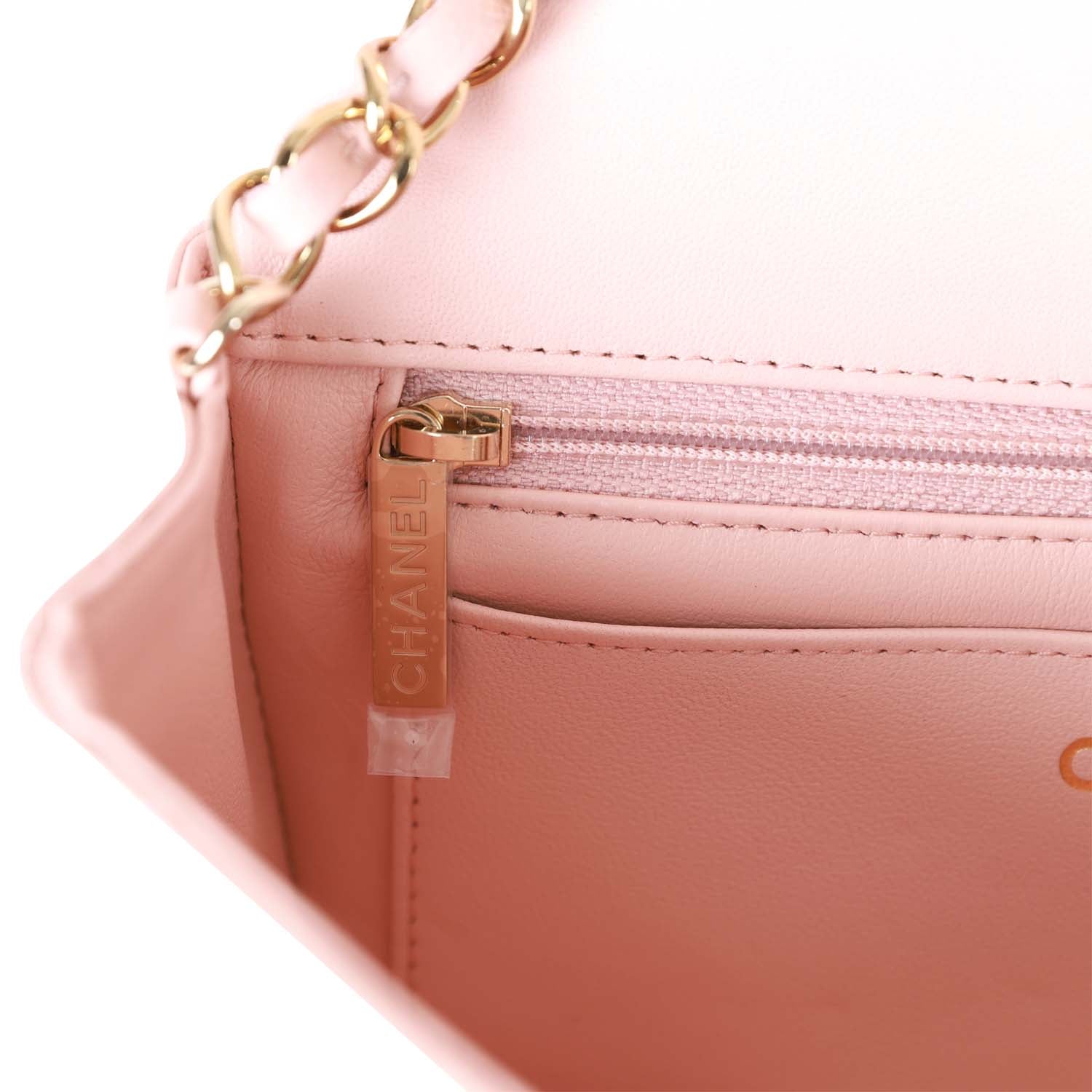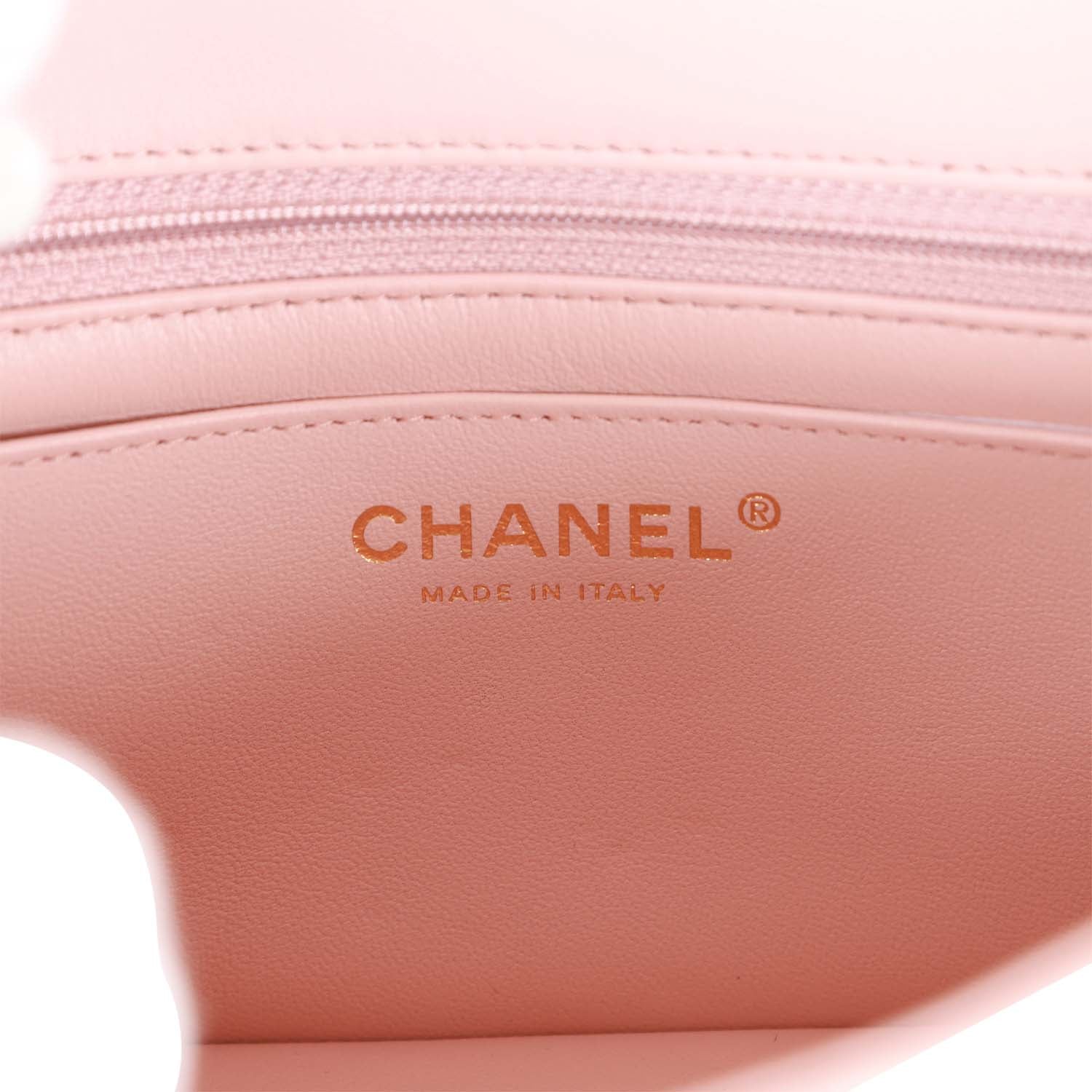 The interior is lined in pink leather and features a zipper pocket with Chanel pull and an open pocket below.